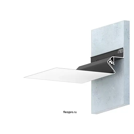 Неокрашенный стеновой парящий профиль Flexy FLY 01 для натяжных потолков с гарпунной системой крепления полотна. С полкой для светодиодной ленты. Без светорассеивающей вставки.
