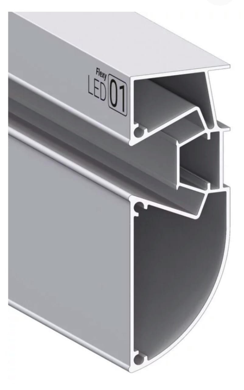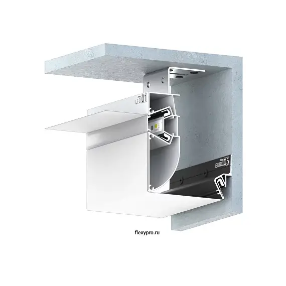 Профиль Flexy LED 01 для многоуровневых натяжных потолков с гарпунной системой крепления полотна. С полкой для светодиодной ленты и светорассеивающей вставкой.