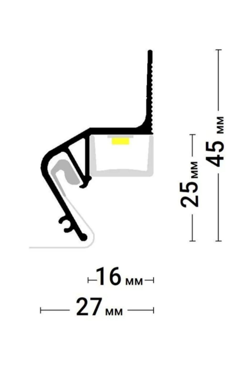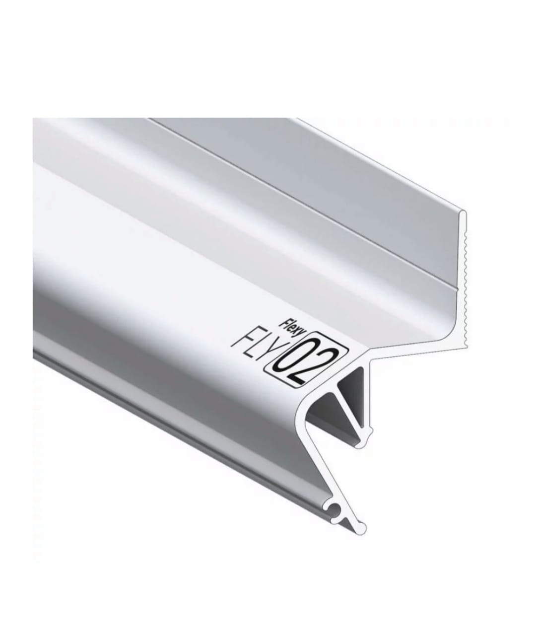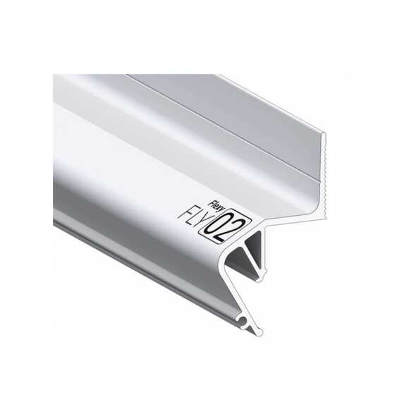Некрашеный стеновой парящий профиль Flexy FLY 02 для натяжных потолков с гарпунной системой крепления полотна. С полкой для светодиодной ленты и креплением для светорассеивающей вставки.