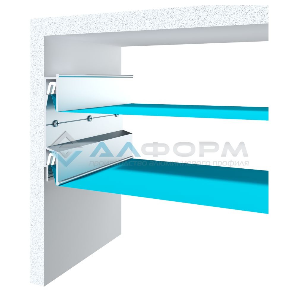 Профиль предназначен для изготовления конструкций по технологии 3Д. Изготовлен из алюминия, отлично выдерживает тяжёлый вес полотна, сложные многоярусные конструкции, обеспечивающие задуманный эффект. Ткань плотно входит в пазы, надёжно держит его. Жёсткость несущего каркаса делает возможным защиту от затопления. Не имеют ограничений по дизайну, сложности проекта, любых криволинейных помещений. Длина 2,5 метра.