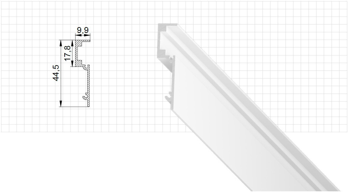 Визуальная особенность держателя заключается в образовании теневой зоны по периметру 5 мм. Таким образом профиль обеспечивает идеально ровный темный контур без установки заглушки. Профиль используется совместно с другими профильными системами LumFer, а именно: SK03 и Sputnik.