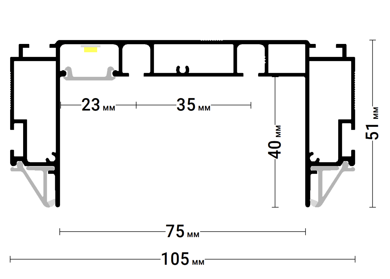 Черный профиль Flexy IZI KARNIZ2 05 для изготовления скрытых п-образных карнизных ниш с двумя пазами для установки штор и гардин. С подсветкой.