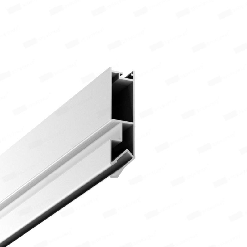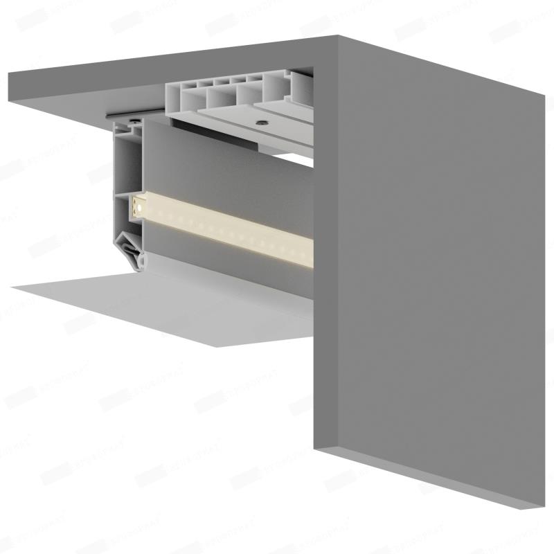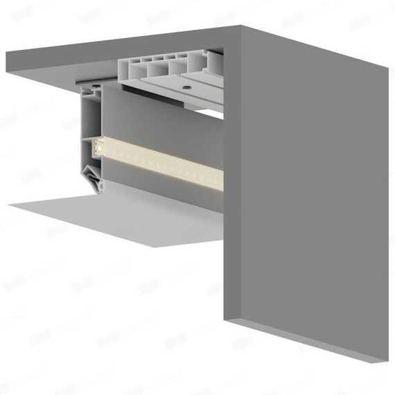Переход для карниза – это специальный алюминиевый профиль чёрного цвета и длиной 2 метра, окрашенный в белый или черный цвет, предназначенный для изготовления ниши под карниз. Конструкция профиля предусматривает возможность установки подсветки. Паз для светодиодной ленты закрывается ПВХ рассеивателем для более равномерного и плавного рассеивания света. Паз для заправки гарпуна закрывается разделительной вставкой.