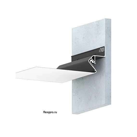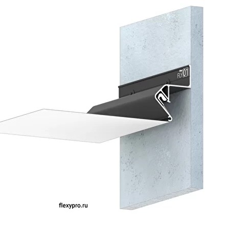 Стеновой парящий профиль Flexy FLY 01 для натяжных потолков с гарпунной системой крепления полотна. С полкой для светодиодной ленты. Без светорассеивающей вставки.