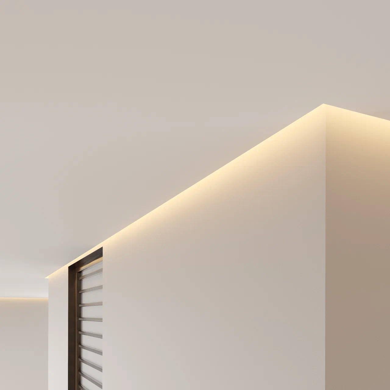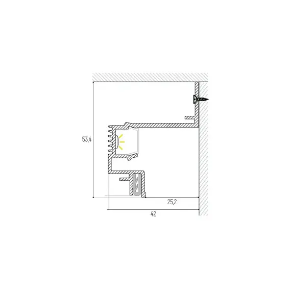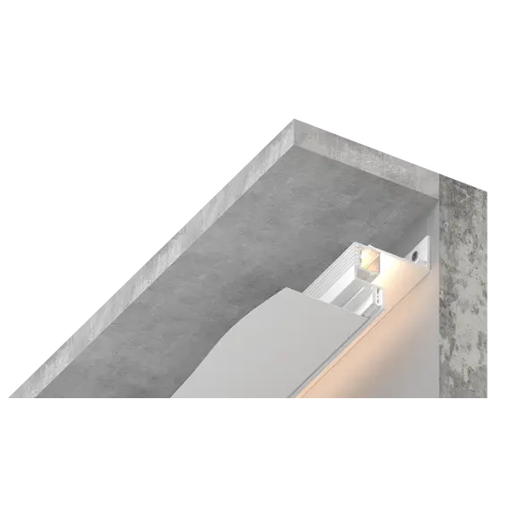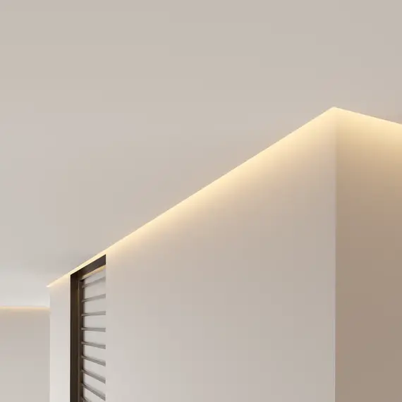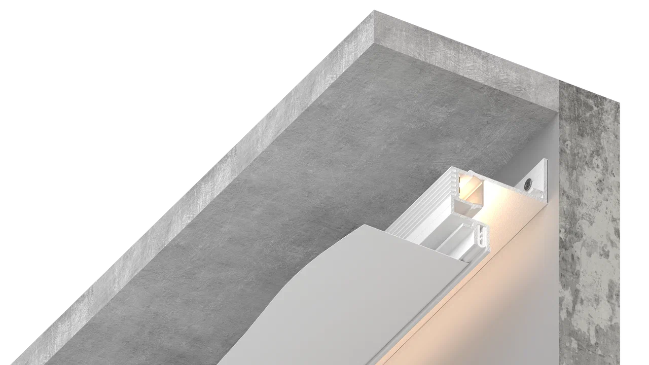 Самонесущая конструкция парящего профиля с фиксированным отступом от стены и мягкой подсветкой, не подчёркивающей неровности стены. Профиль поставляется в комплекте с демпфером.