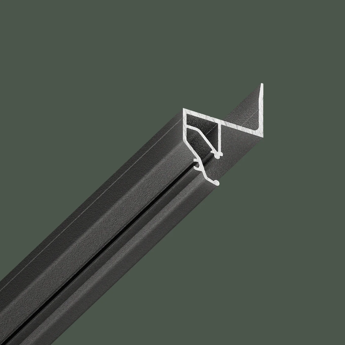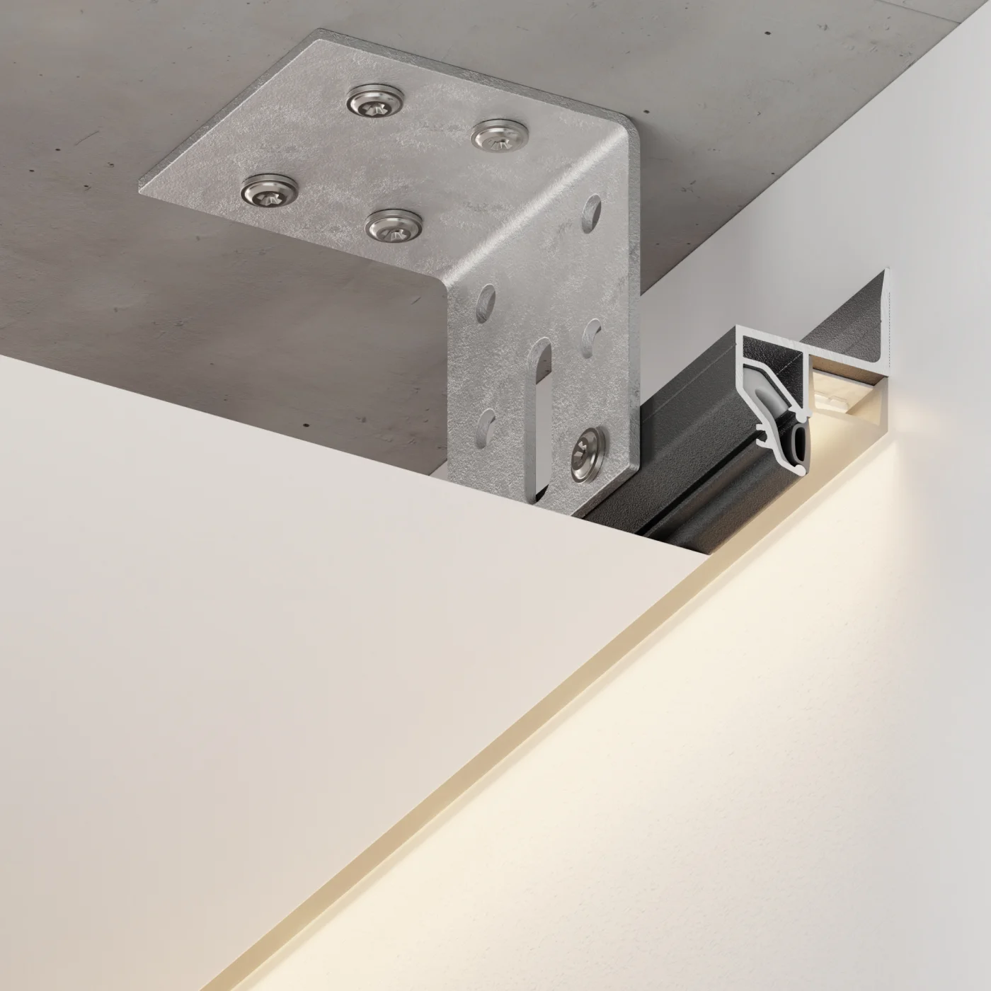 Конструкционный парящий профиль для натяжных потолков с гарпунной системой крепления полотна, паз под гарпун закрывается вставкой. С полкой для светодиодной ленты и креплением для светорассеивающей вставки. Добавлена камера для вкручивания саморезов.