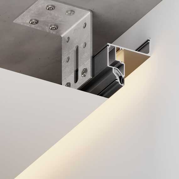 Конструкционный парящий профиль для натяжных потолков с гарпунной системой крепления полотна. Паз под гарпун закрывается вставкой. Паз для светодиодной ленты закрывается светорассеивающим экраном.