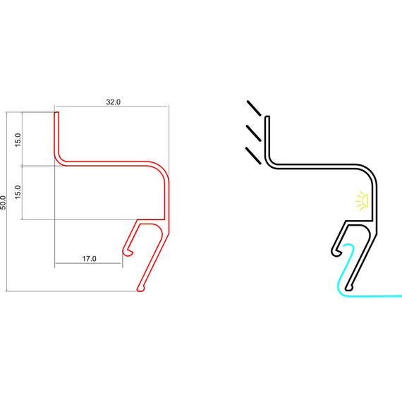 Стеновой парящий профиль ПК6 для натяжных потолков с гарпунной системой крепления полотна. С полкой для светодиодной ленты. Используется без вставки.