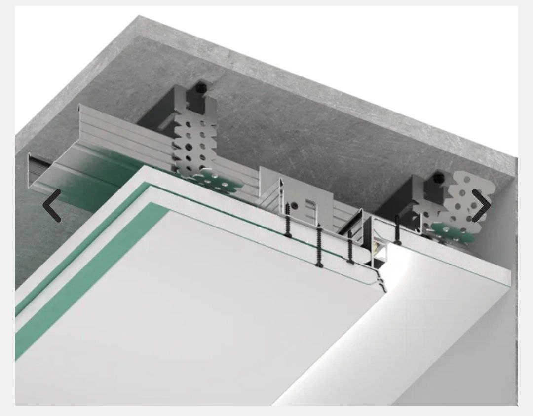 Профиль используется для создания эффекта “парящего в воздухе” потолка из гипсокартона, потолок крепится с отступом от стен. Место крепления конструкции незаметно, по всему периметру потолок подсвечивается мягким свет.