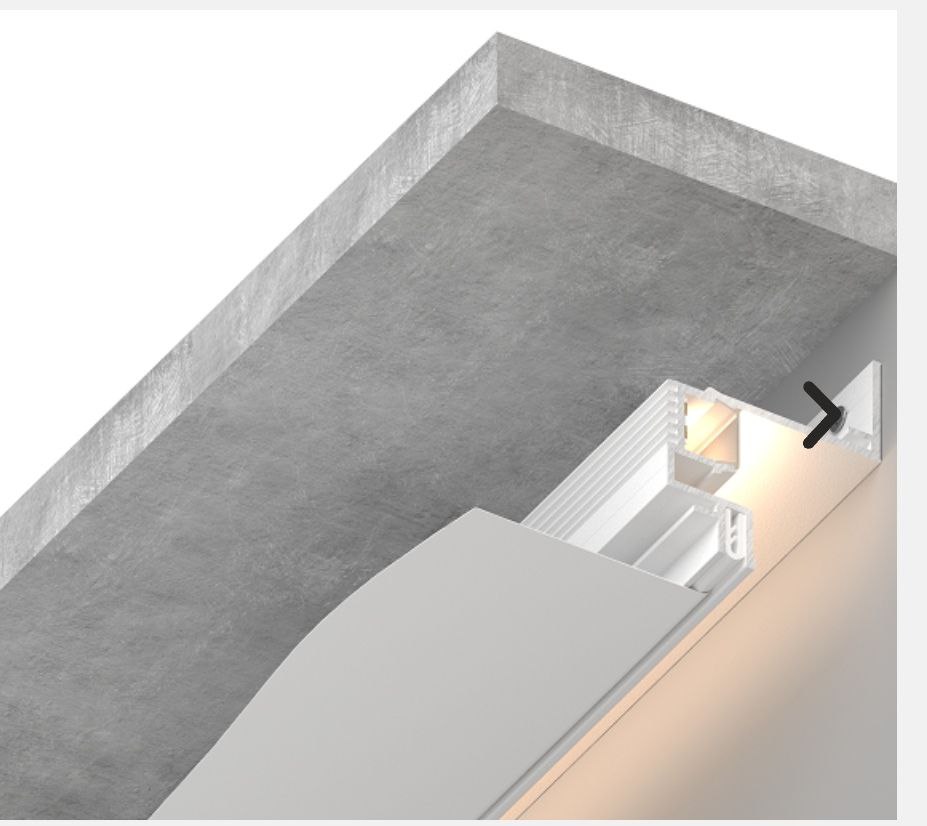 Самонесущая конструкция парящего профиля с фиксированным отступом от стены и мягкой подсветкой, не подчёркивающей неровности стены. Профиль поставляется в комплекте с демпфером.