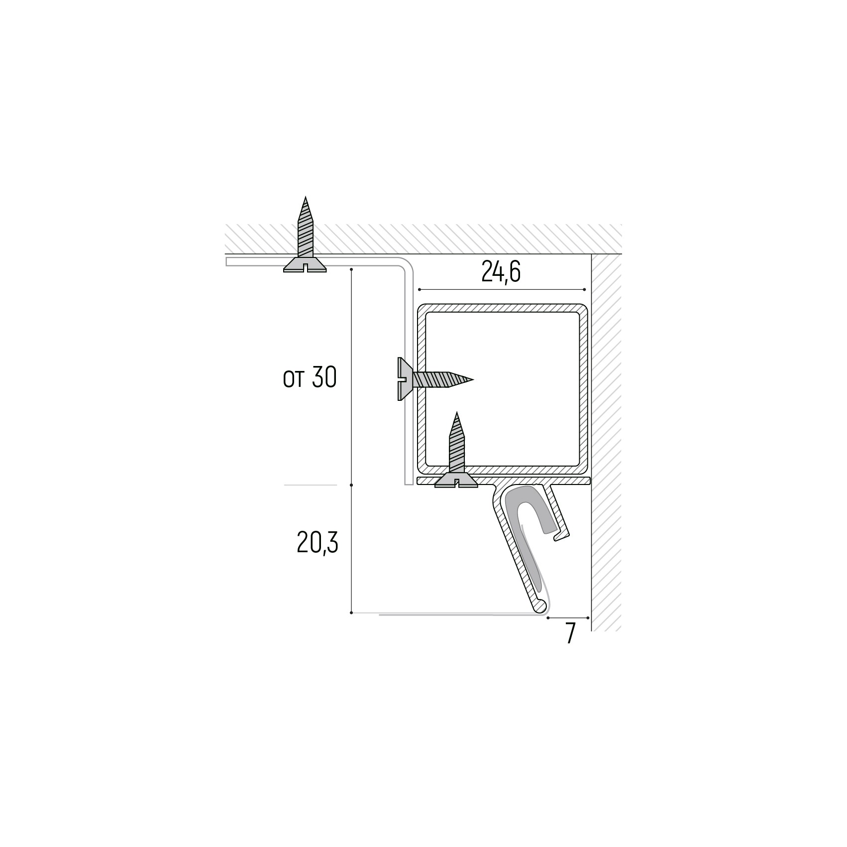 Это дизайнерское решение, которое помогает объединить плоскости стен и натяжного потолка. Благодаря такому методу на стене остаётся правильный, ровный теневой зазор, создаётся ощущение, словно потолок парит в воздухе, совершенно не касаясь стен. Существует несколько модификаций — стеновой, потолочный и усиленная версия для больших площадей (strong)