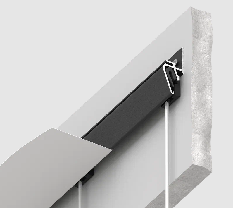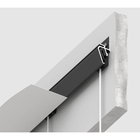 Решение представляет собой алюминиевую конструкцию EUROKRAAB, внутрь зазора вставляются специальные клипсы механическим способом, из которых тянется тонкий прозрачный подвес с крючком. Теперь можно не портить стены и обойтись без дополнительных инструментов.