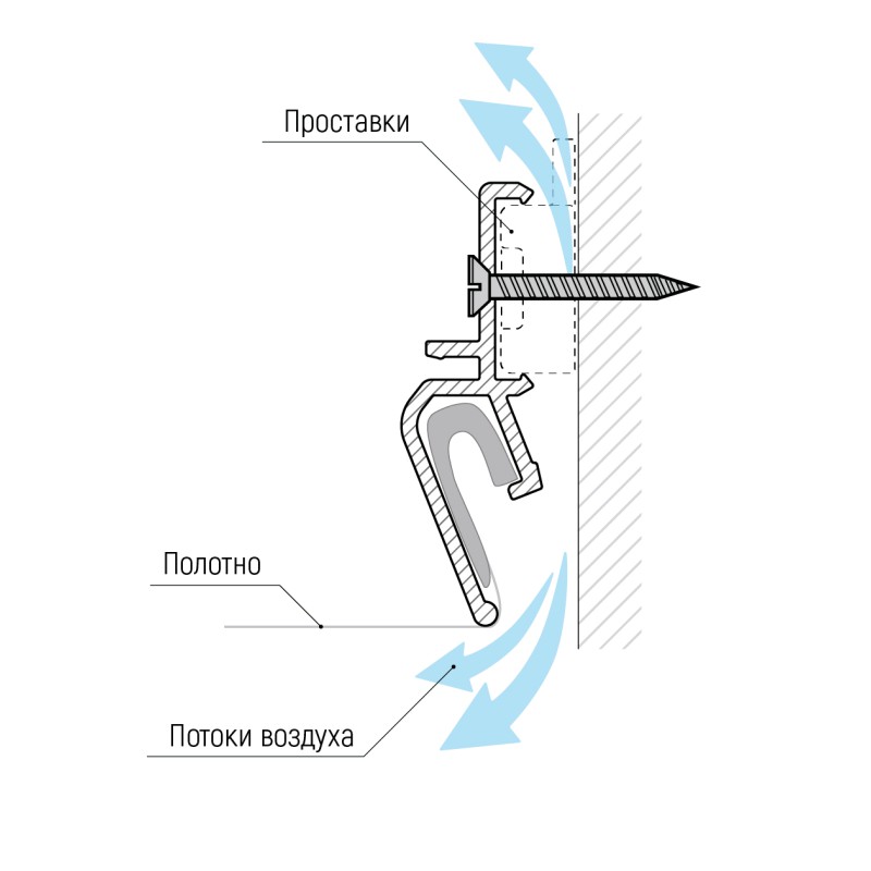 Решение реализуется с помощью пластиковых проставок в профиле, которые создают вентиляционное отверстие между стеной и полотном.