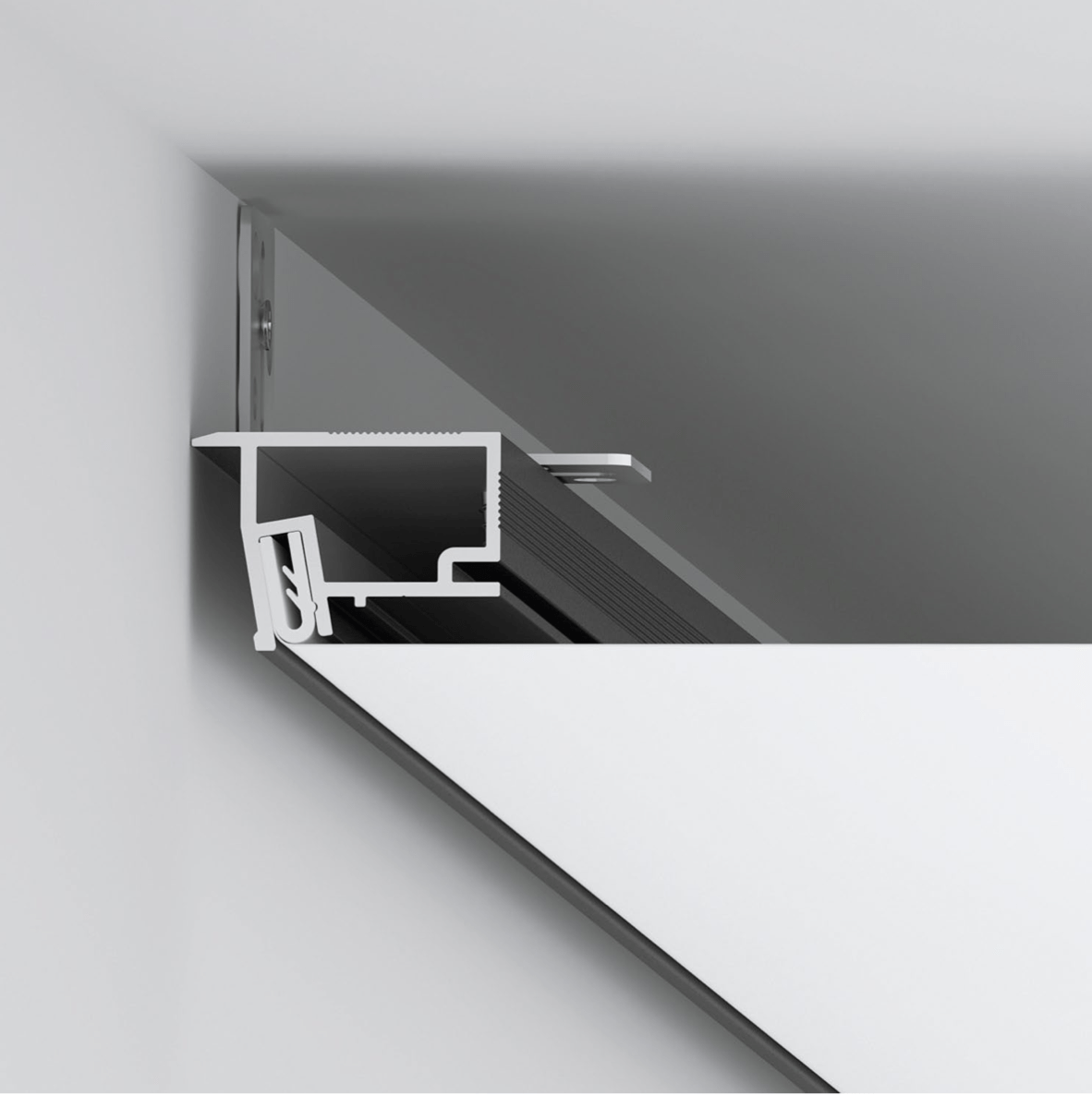 Профильная система SLIM EuroSlott с высотой профиля всего 20 мм позволяет максимально сохранить высоту финишного потолка. Крепится на специальные консоли к потолку.
