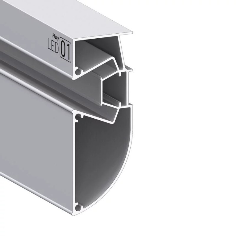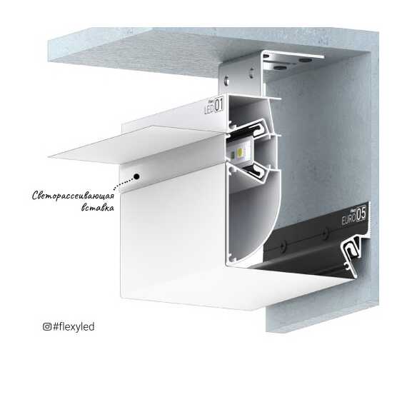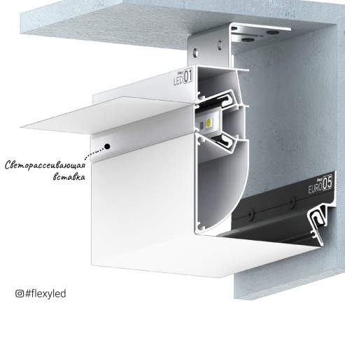 Профиль Flexy LED 01 для многоуровневых натяжных потолков с гарпунной системой крепления полотна. С полкой для светодиодной ленты и светорассеивающей вставкой.