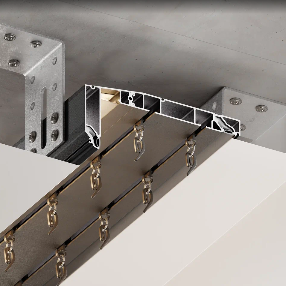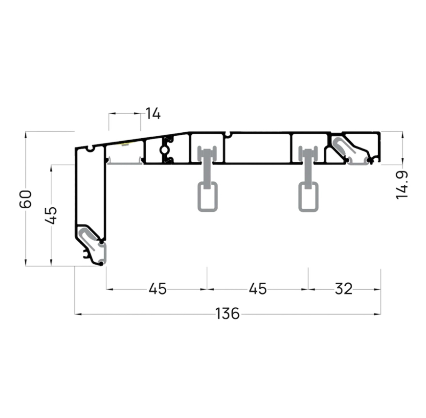 Профиль для изготовления скрытых карнизных ниш с двумя пазами под установку штор и тюля. Увеличенная глубина и расстояние между камерами 45 мм обеспечивают плавный и бесшумный ход бегунков. Пазы под гарпун закрываются PVC-вставкой.