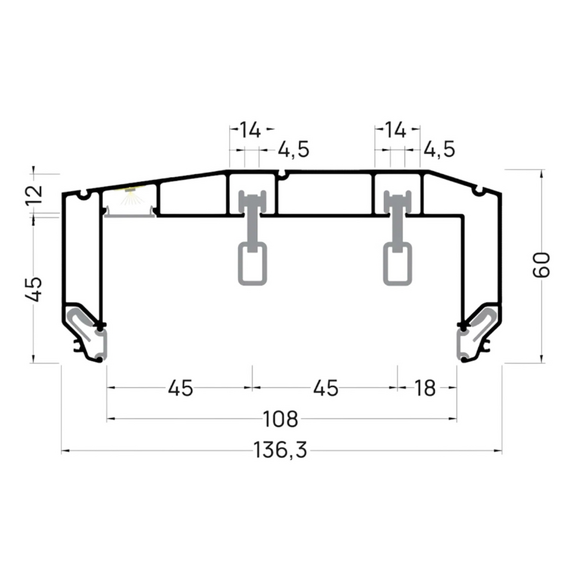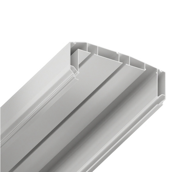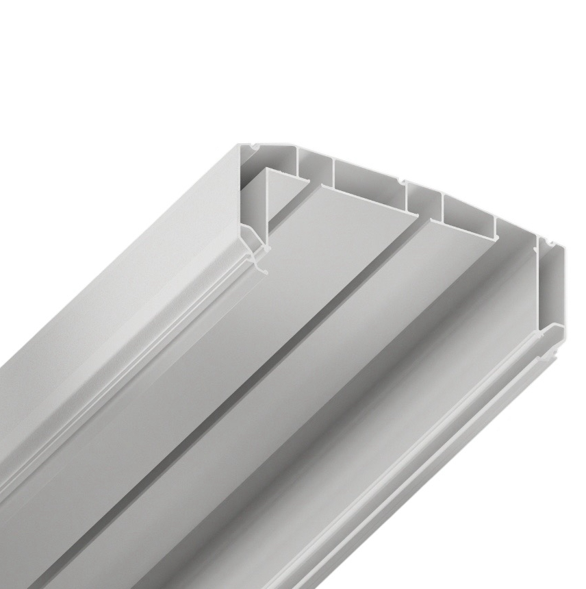 Профиль для изготовления скрытых П-образных карнизных ниш с двумя пазами под установку штор и тюля. Увеличенная глубина и расстояние между камерами 45 мм обеспечивают плавный и бесшумный ход бегунков. Пазы под гарпун закрываются PVC-вставкой.
