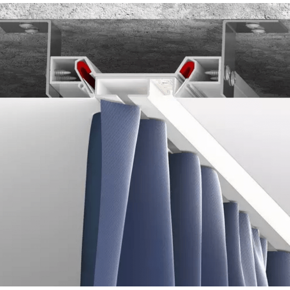 Вкладыш VMK01 представляет собой гардину белого или черного цвета с одним рядом для крючков и местом для установки подсветки. Он устанавливается в профиль MK01 и закрывает пазы для крепления гарпуна. Возможна установка светодиодной ленты и рассеивателя для подсветки штор. Освещение от подсветки распространяется вертикально вниз. Конструкция профиля предусматривает фиксацию полотна при помощи гарпунной системы крепления.