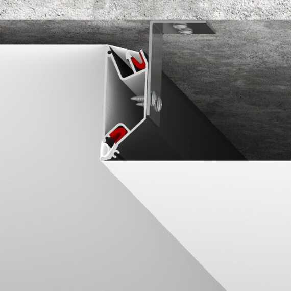 При помощи профиля LumFer PU60 можно реализовывать переходы уровня, выполнять ниши для установки спотов. Профиль крепится к потолку при помощи анкерных уголков. При монтаже LumFer PU60 расстояние от базового потолка до верхнего уровня составит от 5 сантиметров, до нижнего уровня от 11 см.