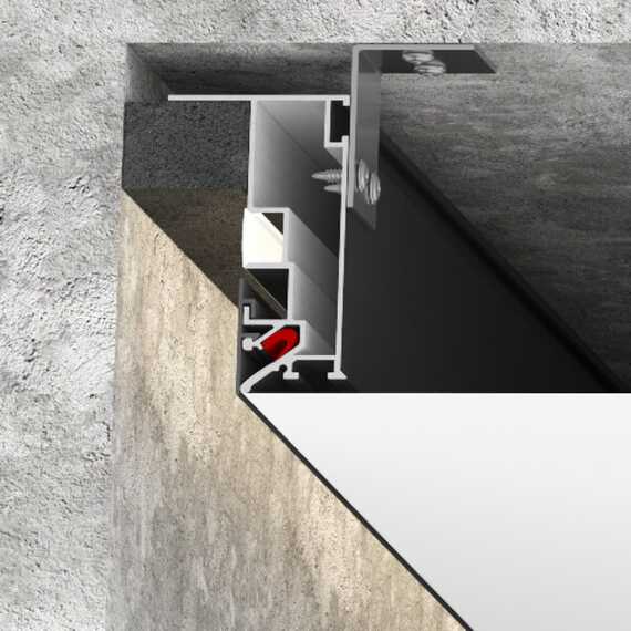 Профиль парящий безрамный LumFer BP03 — в данном решении потолок не имеет примыкания к стенам и дает ощущение парящего в воздухе потолка. Визуальная особенность безрамного потолка — отсутствие вставки и наличие «теневой зоны» от 2 до 3,5 см вдоль стены. Между профилем и стеной монтируется специальный саморасширяющийся поролон (ПСУЛ) черного цвета, который скрывает все неровности стен.