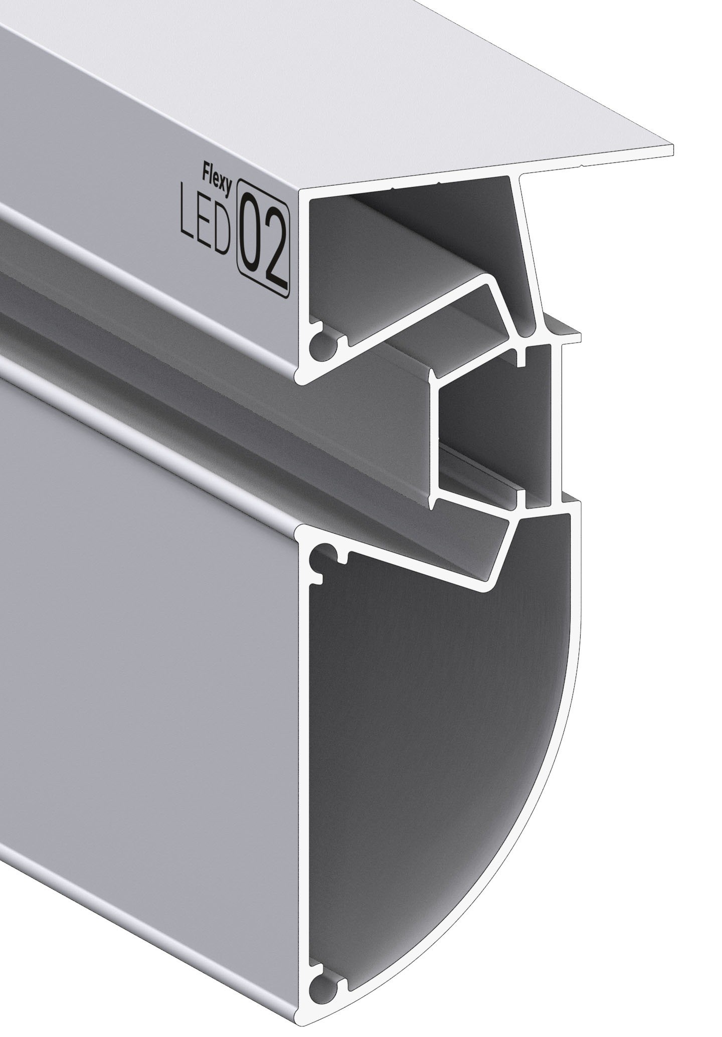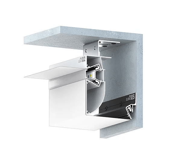 Профиль Flexy LED 02 для многоуровневых натяжных потолков с гарпунной системой крепления полотна. С полкой для светодиодной ленты и светорассеивающей вставкой.
