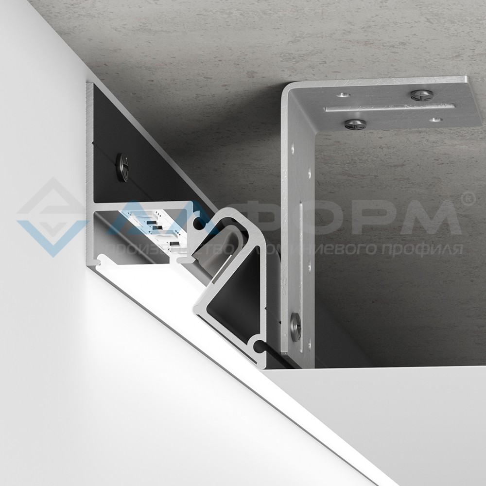 Алюминиевый профиль для монтажа натяжного потолка из ПВХ пленки на гарпунной системе крепления с возможностью организации парящего эффекта с подсветкой вдоль периметра помещения.