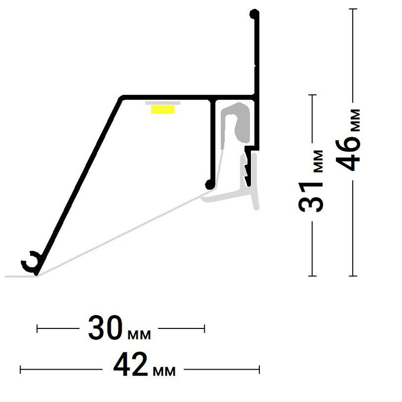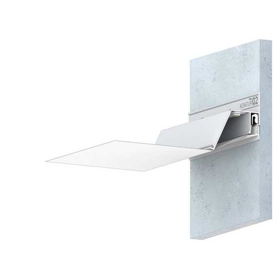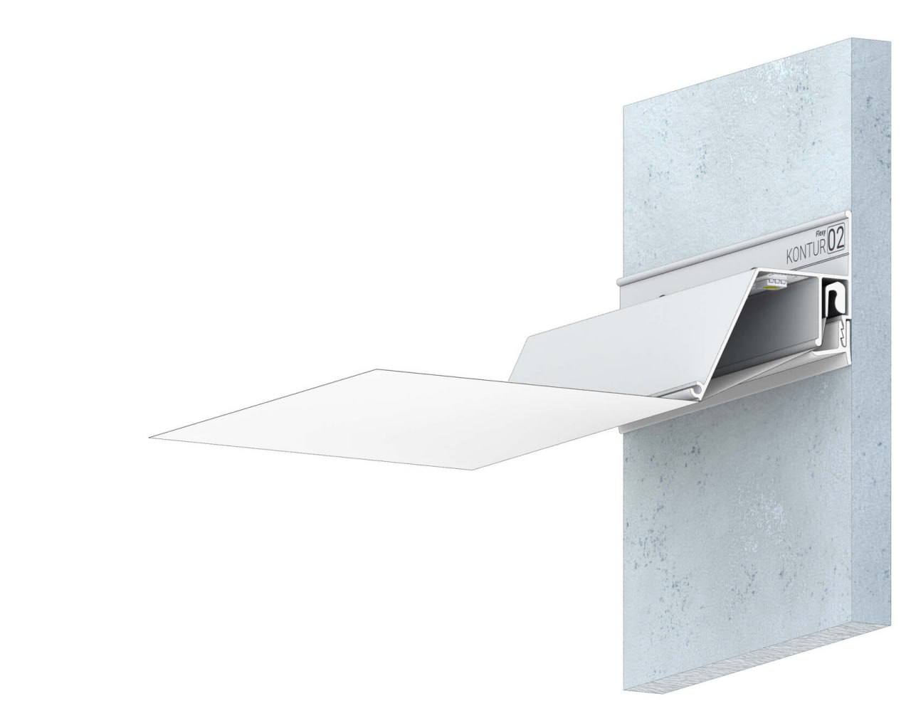 Стеновой контурный профиль Flexy KONTUR 02 для натяжных потолков с гарпунной системой крепления полотна. С полкой для светодиодной ленты для подсветки через полотно, направленной в сторону. По периметру профиль закрывается стеновой вставкой.
