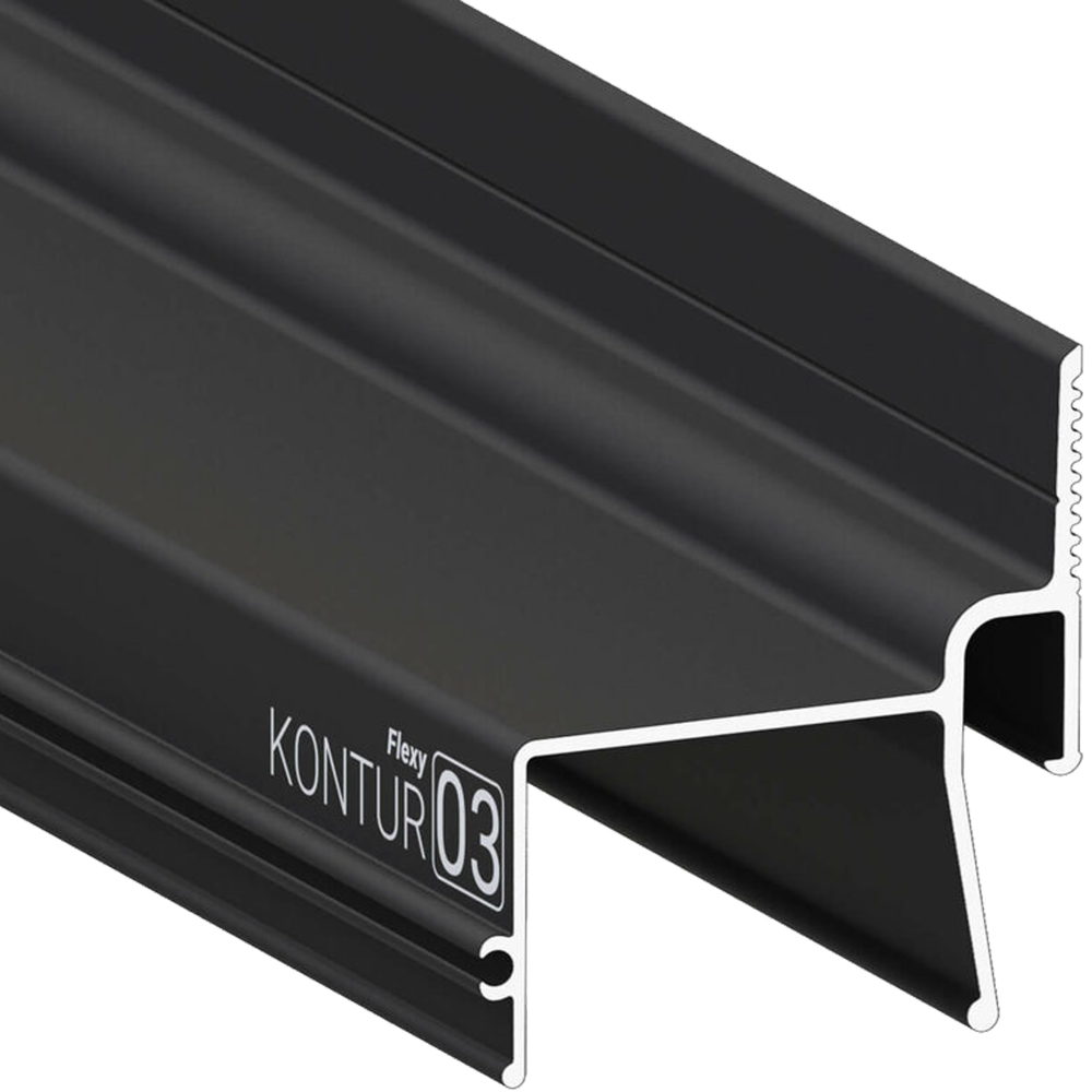 Профиль Flexy KONTUR 03 (ПФ2633), чёрный (2м) предназначен для монтажа натяжных потолков с применением уникальной гарпунной системы крепления полотна. Особенность данного профиля – наличие специальной полки, предназначенной для монтажа светодиодной ленты, которая обеспечивает эффектную подсветку через полотно, направленную вниз. Такая установка создает особый эффект и добавляет пространству неповторимость и уют. Благодаря теневому зазору, профиль предоставляет возможность играть с эффектом освещения, создавая интересные световые композиции и придавая помещению стильный и современный вид.