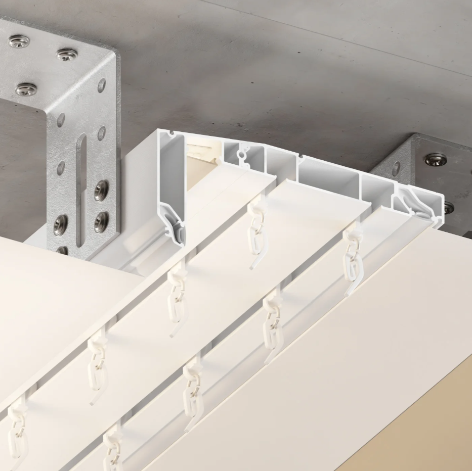 Профиль для изготовления скрытых карнизных ниш с двумя пазами под установку штор и тюля. Увеличенная глубина и расстояние между камерами 45 мм обеспечивают плавный и бесшумный ход бегунков. Пазы под гарпун закрываются PVC-вставкой.