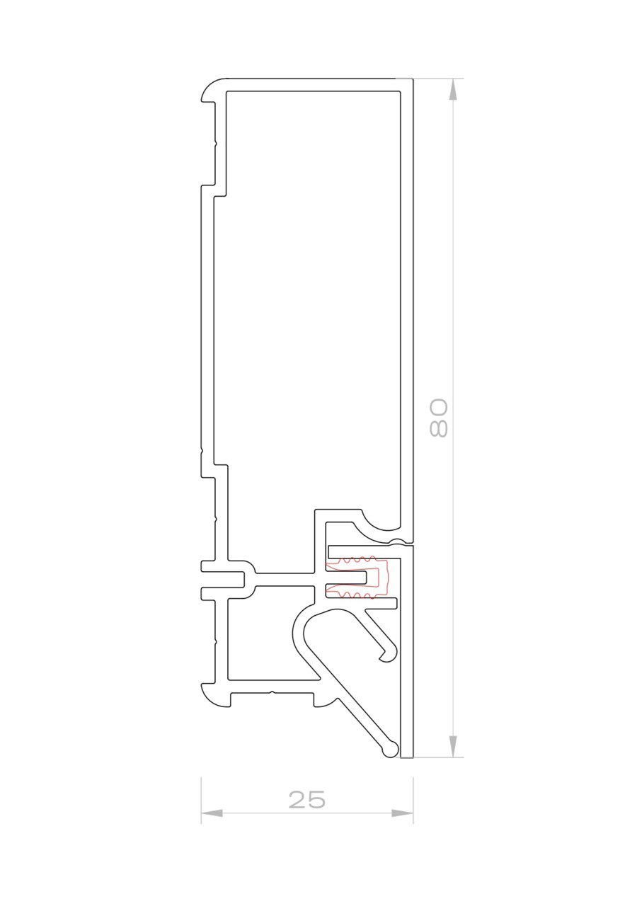 Конструкционный профиль без подсветки высотой 80ммПрофиль имеет фиксированный размер 80мм в высоту и 25мм в ширинуМожет применяться, как с пвх полотнами, так и с тканевыми при помощи системы "клинч"Профиль позволяет красиво “оборвать” натяжной потолок с получением ровного закрытого торцаНиши для штор, ниши для светильников, переходы уровня, обходы лестниц, обходы реек и тдПолучил модернизированную систему фиксации уголка и удобные пазы для стыковки под наши соединителиПрофиль продается в комплекте с уплотнителем, уголком и парой прямых коротких соединителей