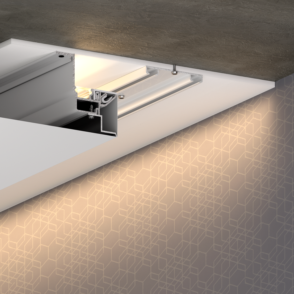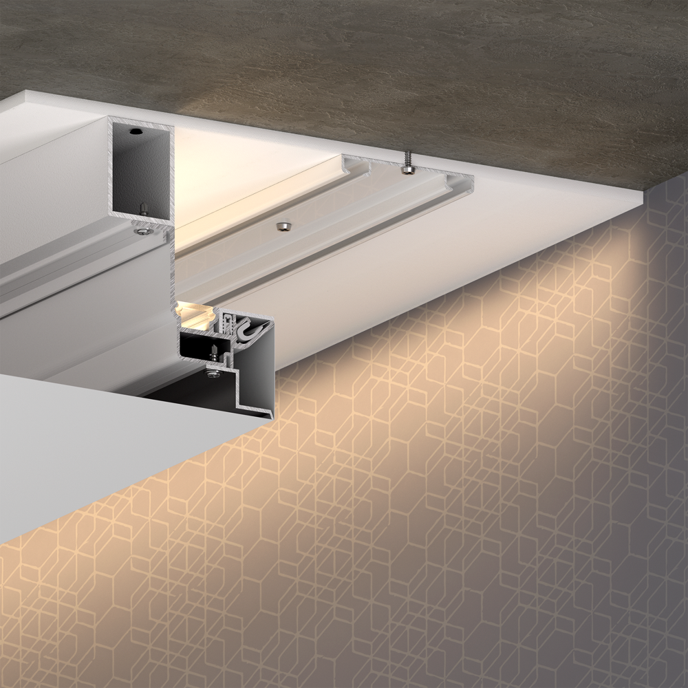Профиль FENIX предназначен для интерьерной подсветки на стену, формирования ниши с подсветкой для штор и зеркал. Комплектуется мягким рассеивателем, а также уголком закрывающим полость для заправки полотна. Отступ от стены 30мм и глубина ниши 45мм.