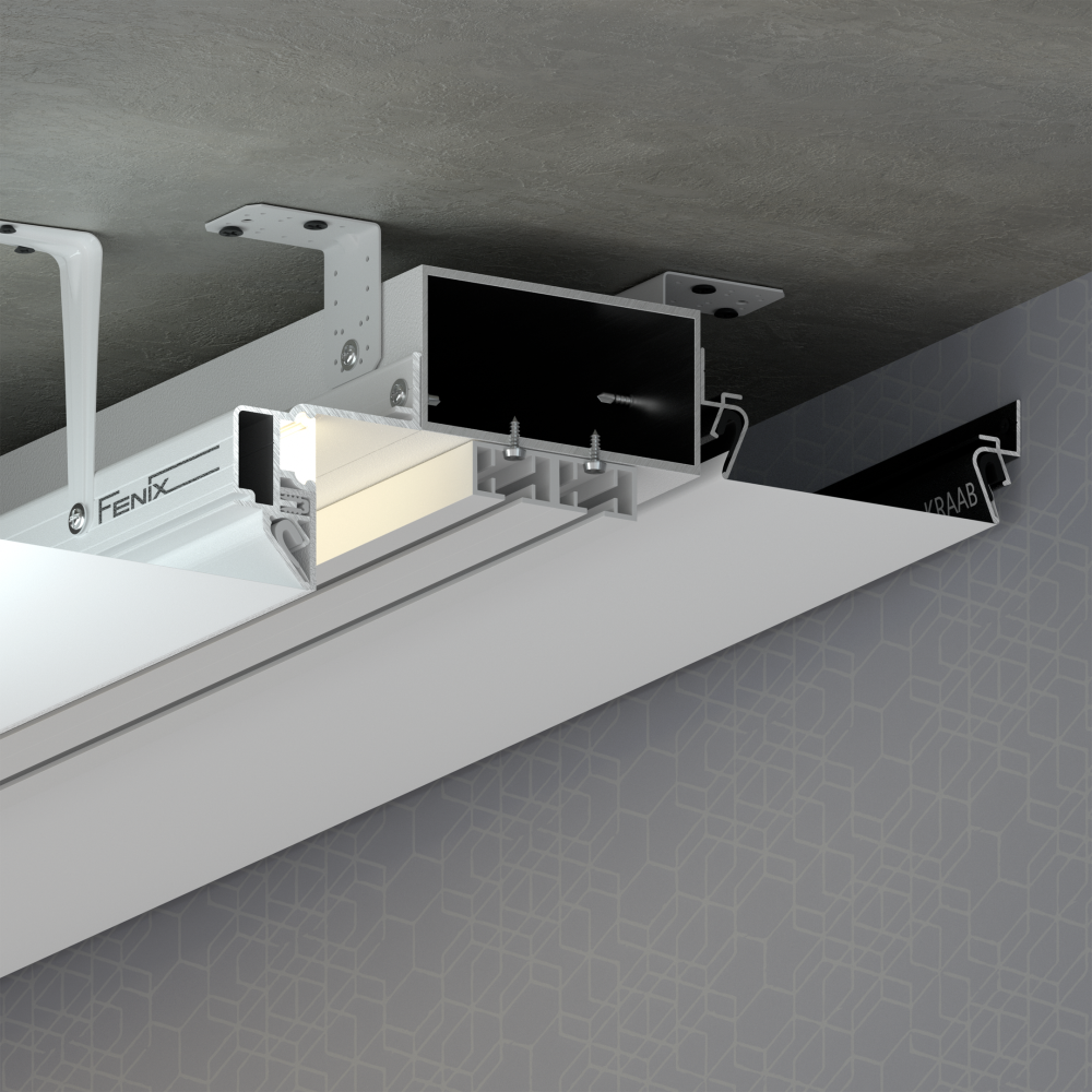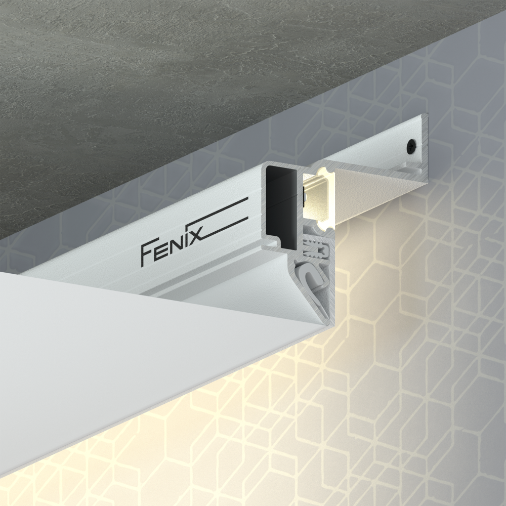 Профиль FENIX предназначен для интерьерной подсветки на стену, формирования ниши с подсветкой для штор и зеркал. Комплектуется мягким рассеивателем, а также уголком закрывающим полость для заправки полотна. Отступ от стены 30мм и глубина ниши 45мм.