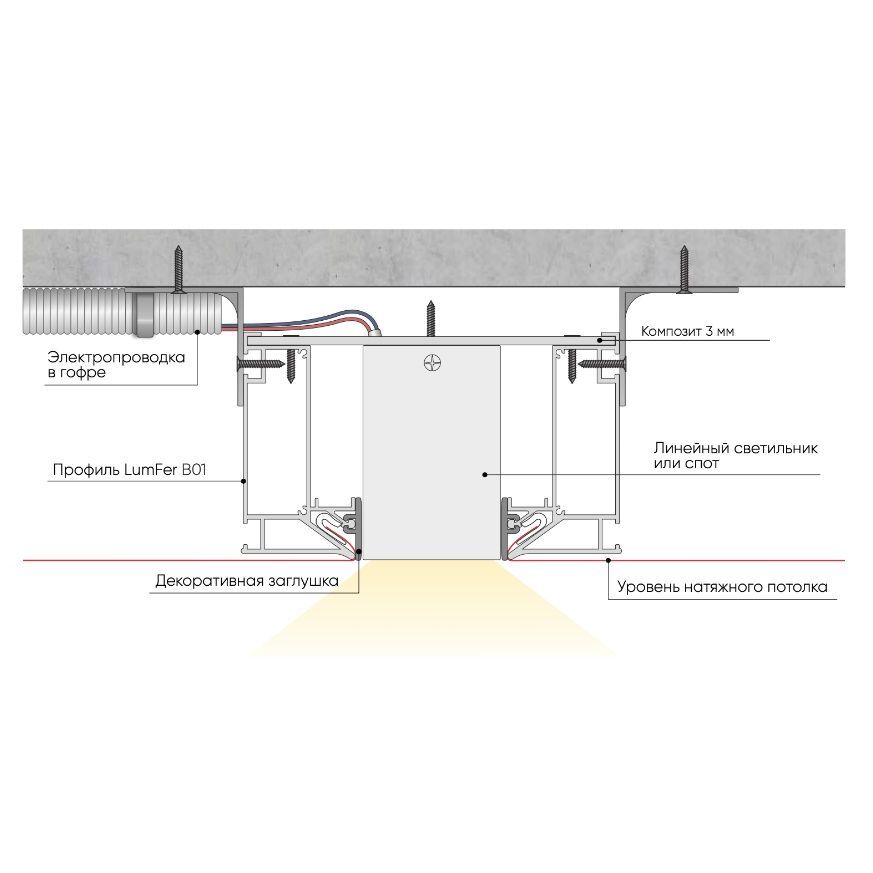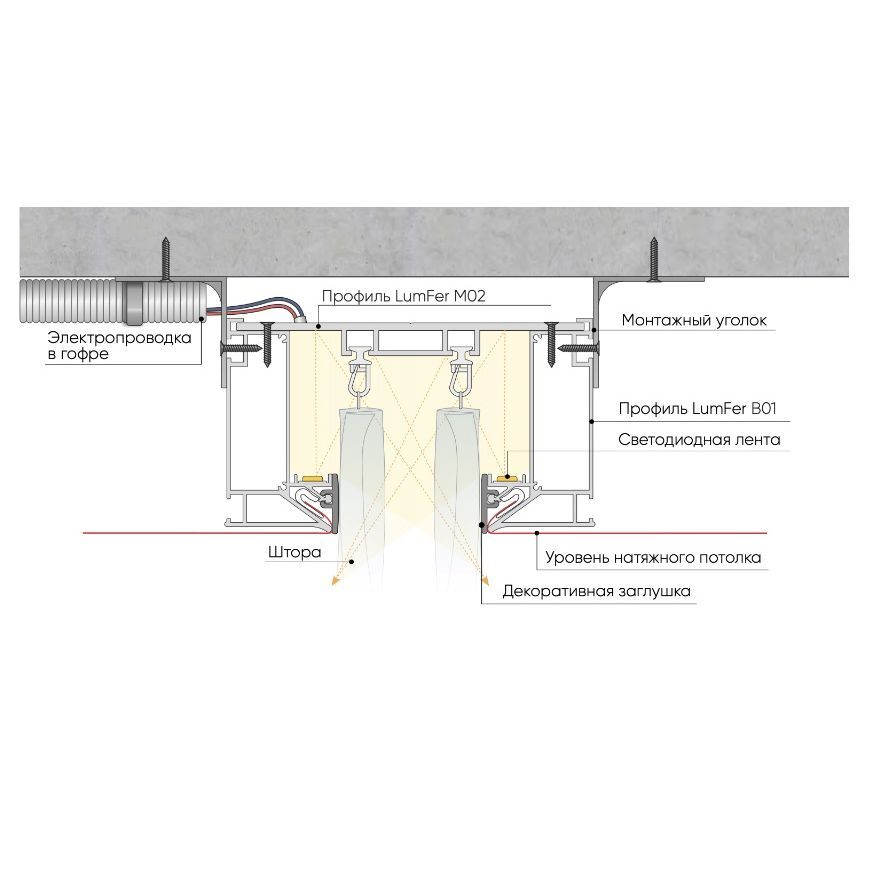 Профиль LUMFER B01 Нишевый — это универсальное решение для оформления ниши штор и освещения, модульный карниз представлен в белом и черном цвете и состоит из нишевого профиля с двумя рядами для крепления крючков оконных занавесок. Ниша глубиной 8 см.