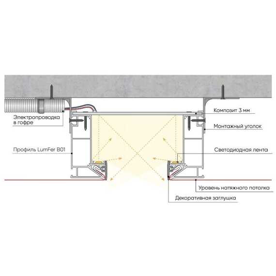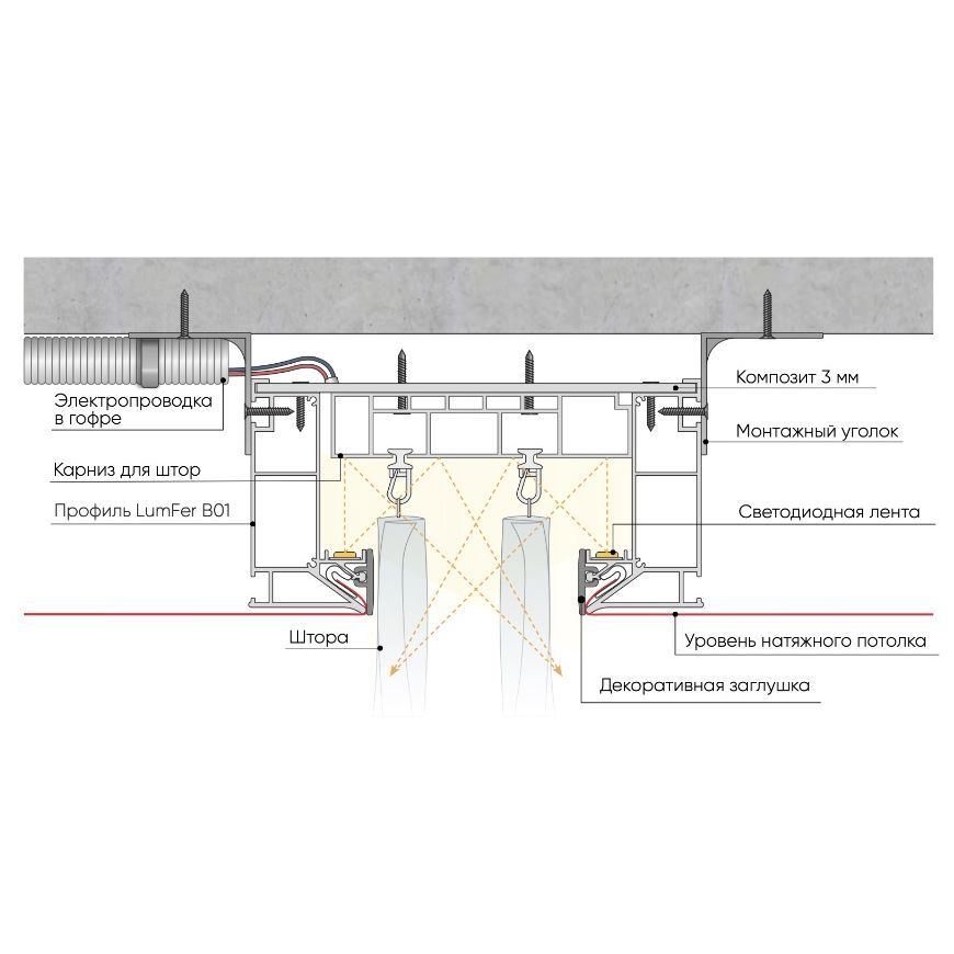 Профиль LUMFER B01 Нишевый — это универсальное решение для оформления ниши штор и освещения, модульный карниз представлен в белом и черном цвете и состоит из нишевого профиля с двумя рядами для крепления крючков оконных занавесок. Ниша глубиной 8 см.