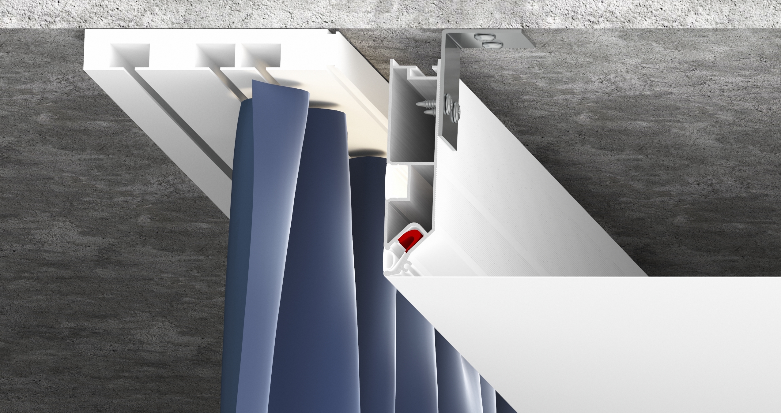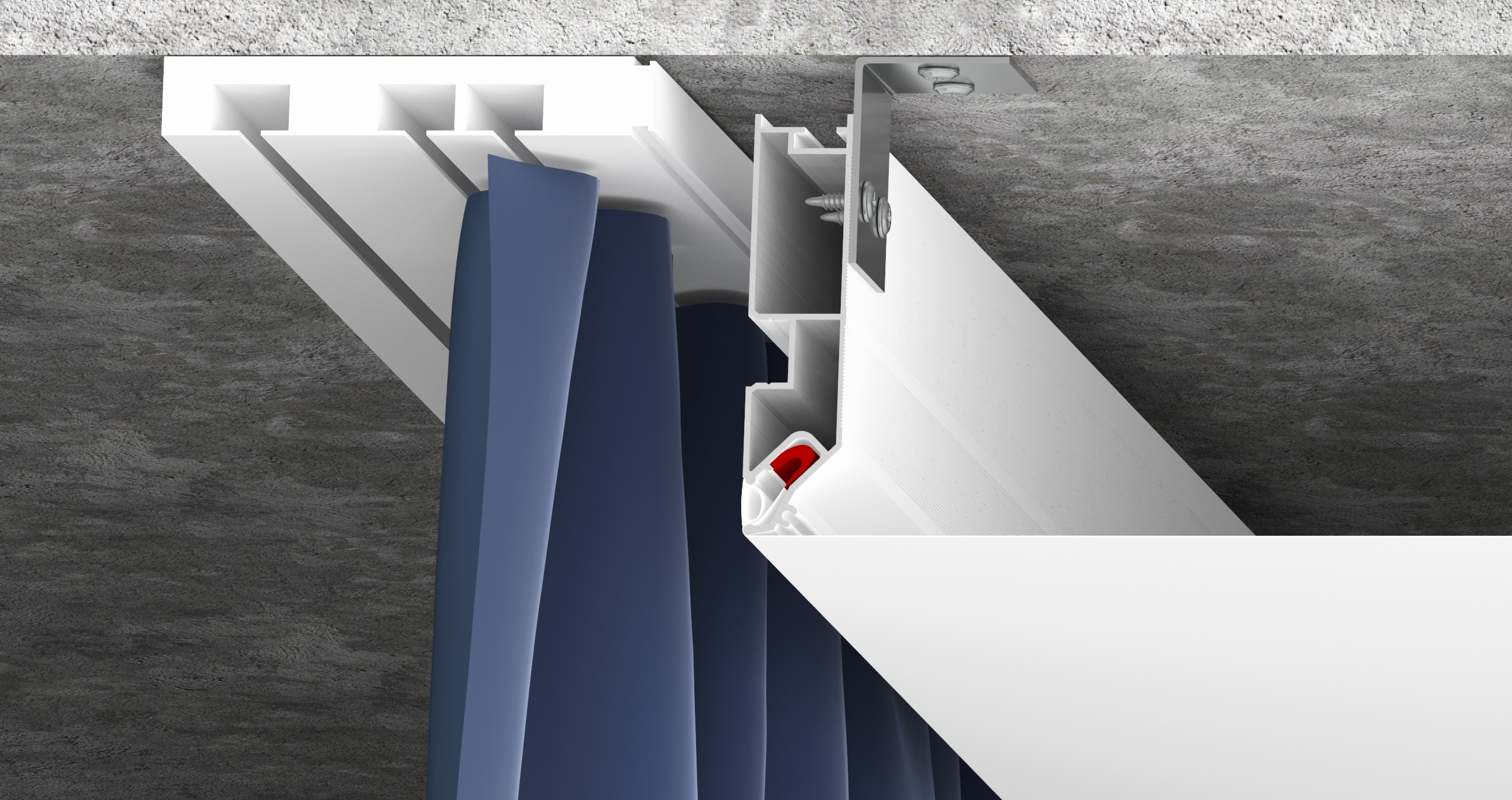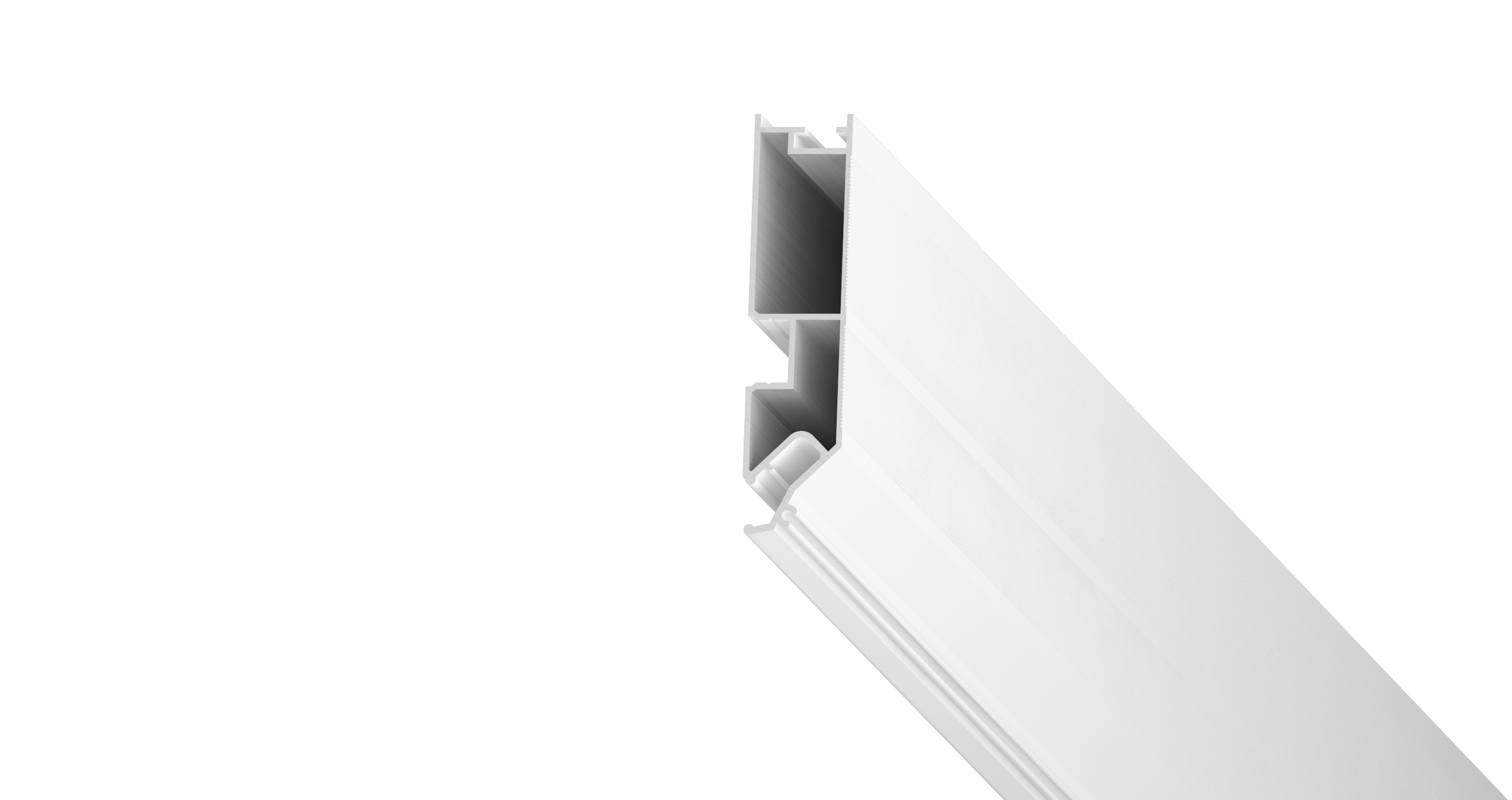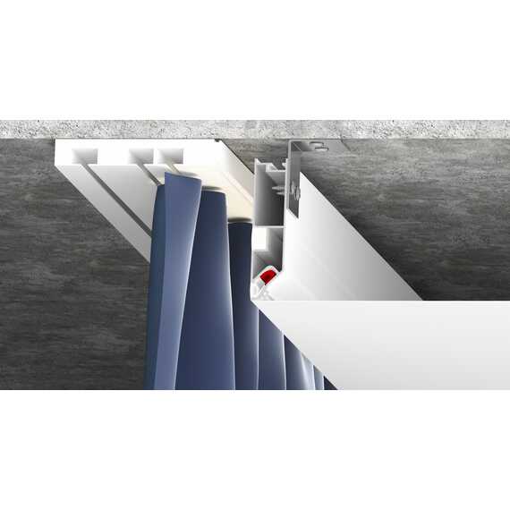 Переход для карниза – это специальный алюминиевый профиль, окрашенный в белый или черный цвет, предназначенный для изготовления ниши под карниз. Конструкция профиля предусматривает возможность установки подсветки. Паз для светодиодной ленты закрывается ПВХ рассеивателем для более равномерного и плавного рассеивания света. Паз для заправки гарпуна закрывается разделительной вставкой.