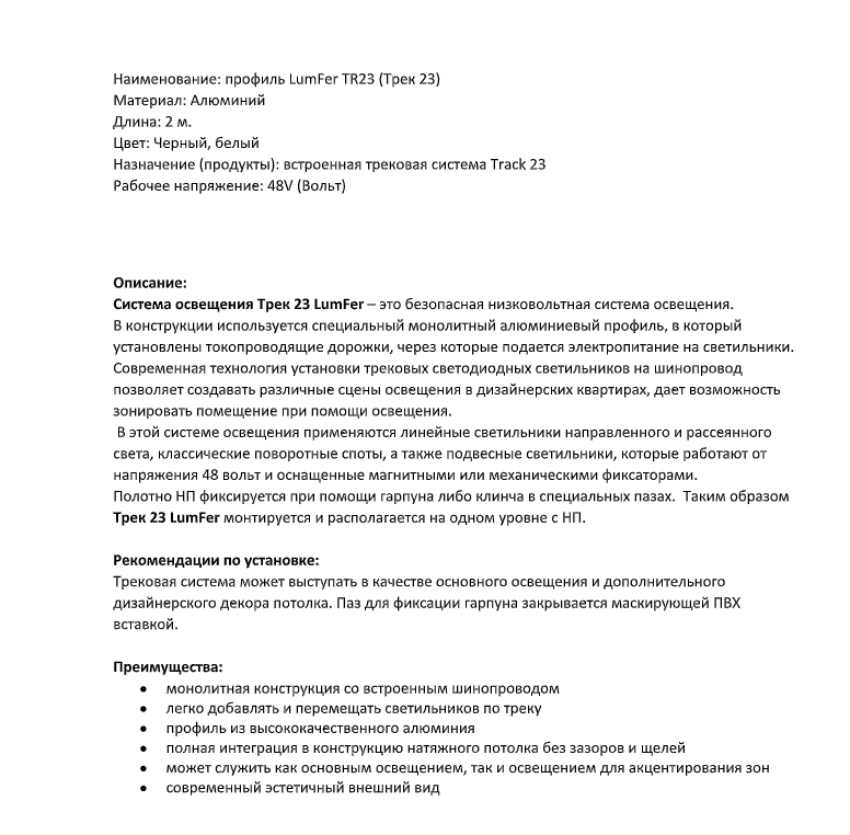 Система освещения Трек 23 LumFer – это безопасная низковольтная система освещения. В конструкции используется специальный монолитный алюминиевый профиль, в который установлены токопроводящие дорожки, через которые подается электропитание на светильники.