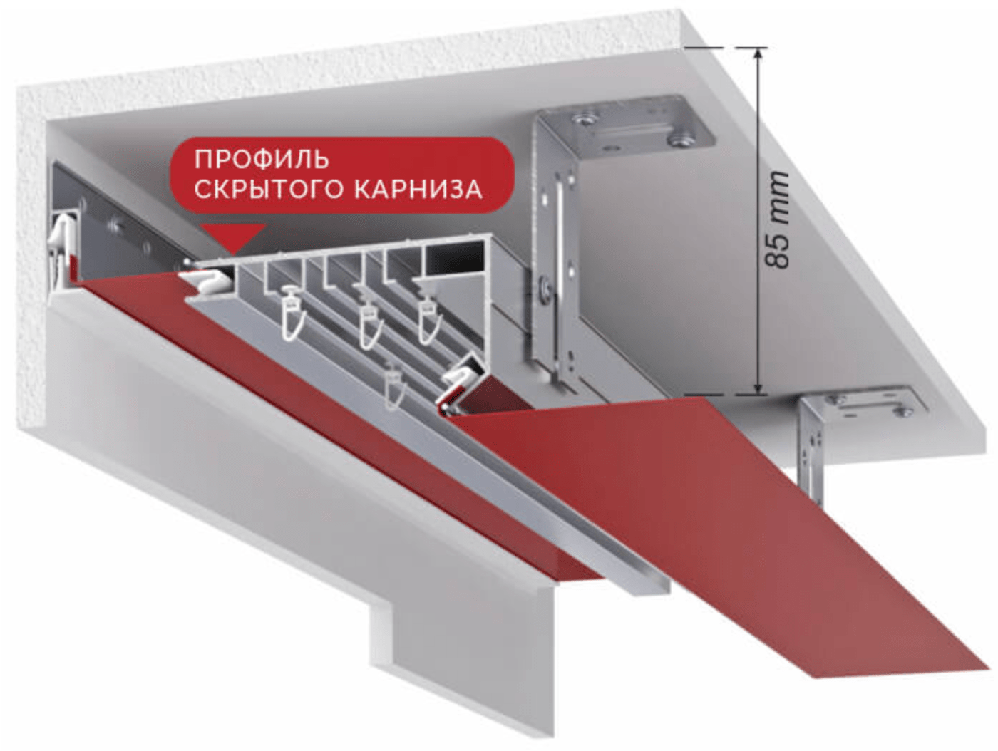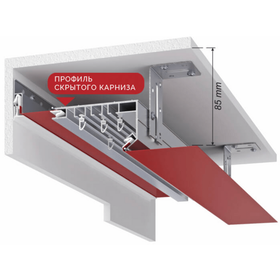 Профиль представляет собой шину для штор трёхполосную под роликовые крючки, совмещенную с пазом для заведения гарпуна полотна. Таким образом совершается и упрощается монтаж «скрытой гардины», торец полотна закрыт, полотно заведено до основного потолка. Это модернизированный вариант классического профиля ПК-5 карниз. Увеличена высота отбойника, добавлены крепежные элементы, изменен пристенный замок.