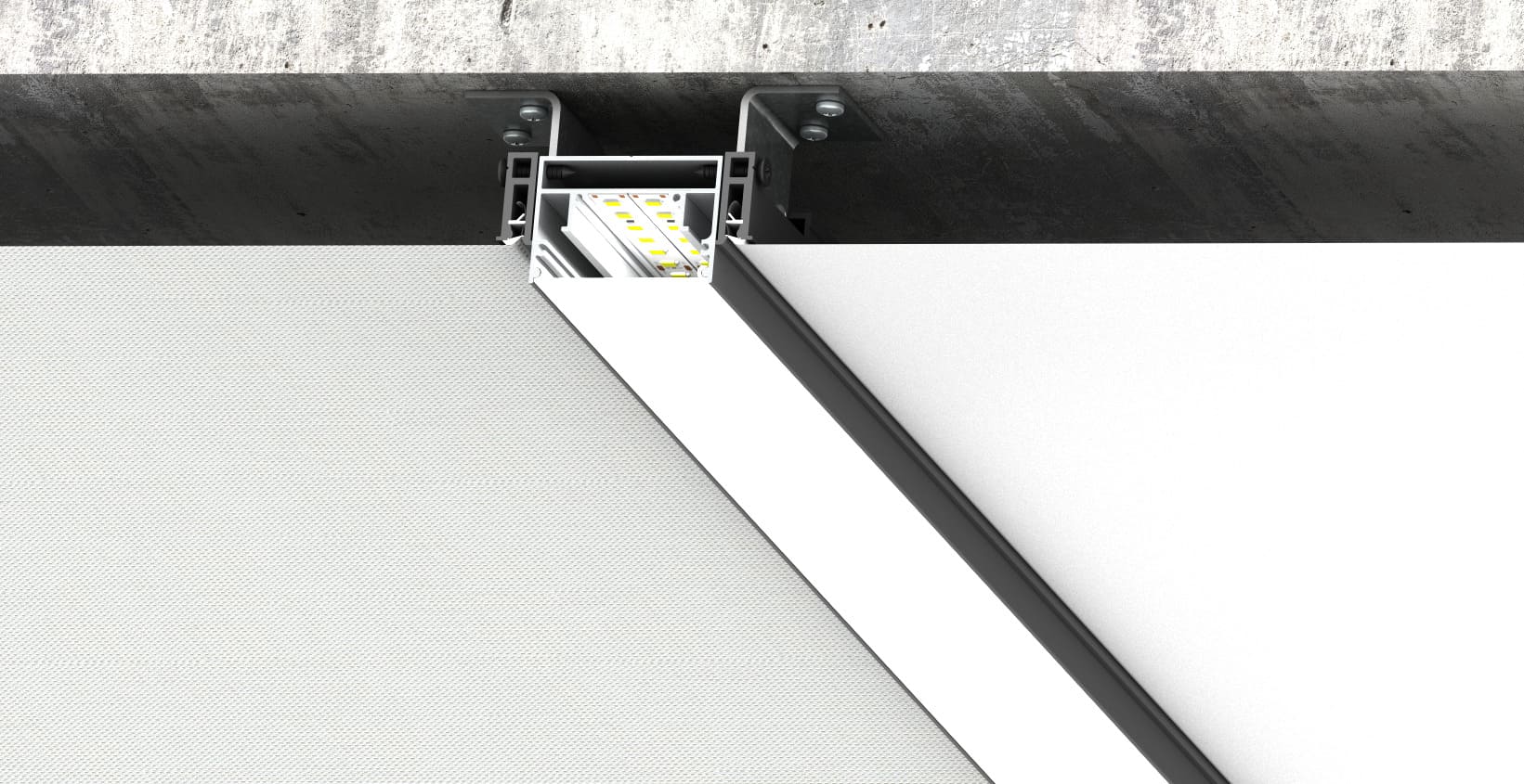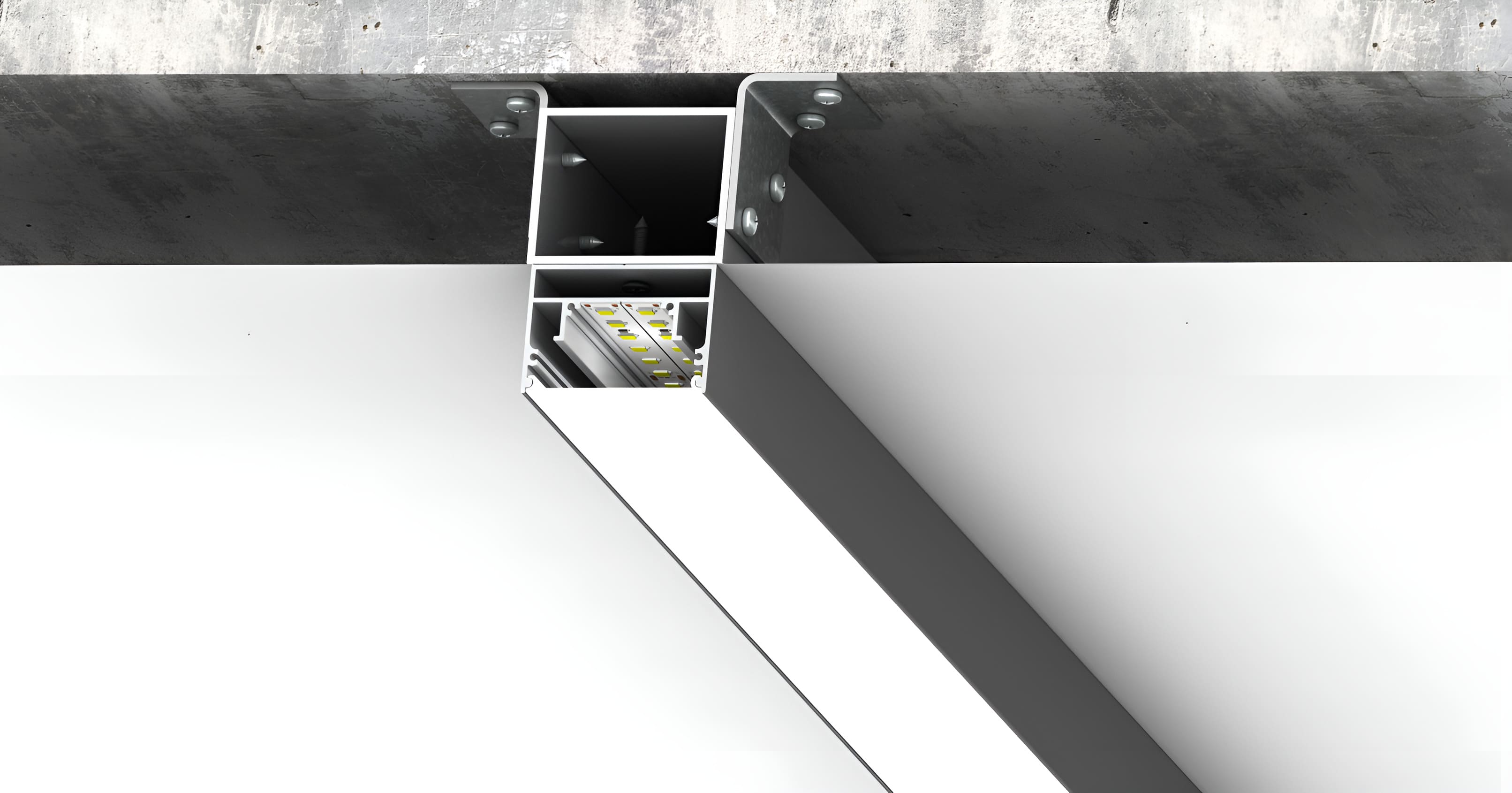 Встраиваемый светодиодный профиль черного цвета для монтажа световых линий в натяжном потолке. Размеры профиля составляют 2000х33х30 мм, с площадкой для размещения светодиодной ленты. К профилю предусмотрены экраны, заглушки и другие аксессуары, которые приобретаются отдельно.