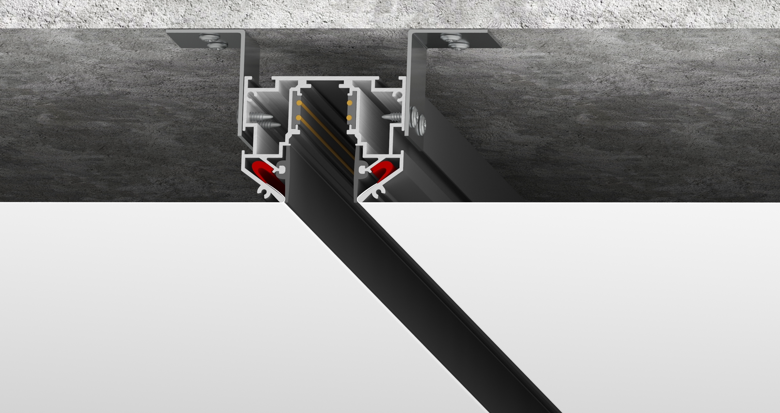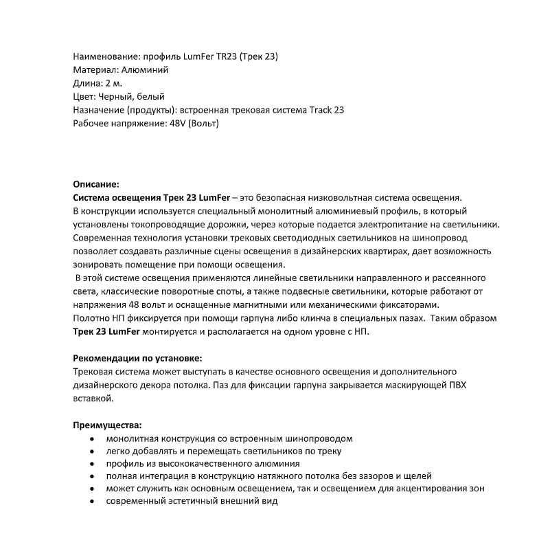 Система освещения Трек 23 LumFer – это безопасная низковольтная система освещения. В конструкции используется специальный монолитный алюминиевый профиль, в который установлены токопроводящие дорожки, через которые подается электропитание на светильники. Современная технология установки трековых светодиодных светильников на шинопровод позволяет создавать различные сцены освещения в дизайнерских квартирах, дает возможность зонировать помещение при помощи освещения. В этой системе освещения применяются линейные светильники направленного и рассеянного света, классические поворотные споты, а также подвесные светильники, которые работают от напряжения 48 вольт и оснащенные магнитными или механическими фиксаторами. Полотно НП фиксируется при помощи гарпуна либо клинча в специальных пазах. Таким образом Трек 23 LumFer монтируется и располагается на одном уровне с НП.