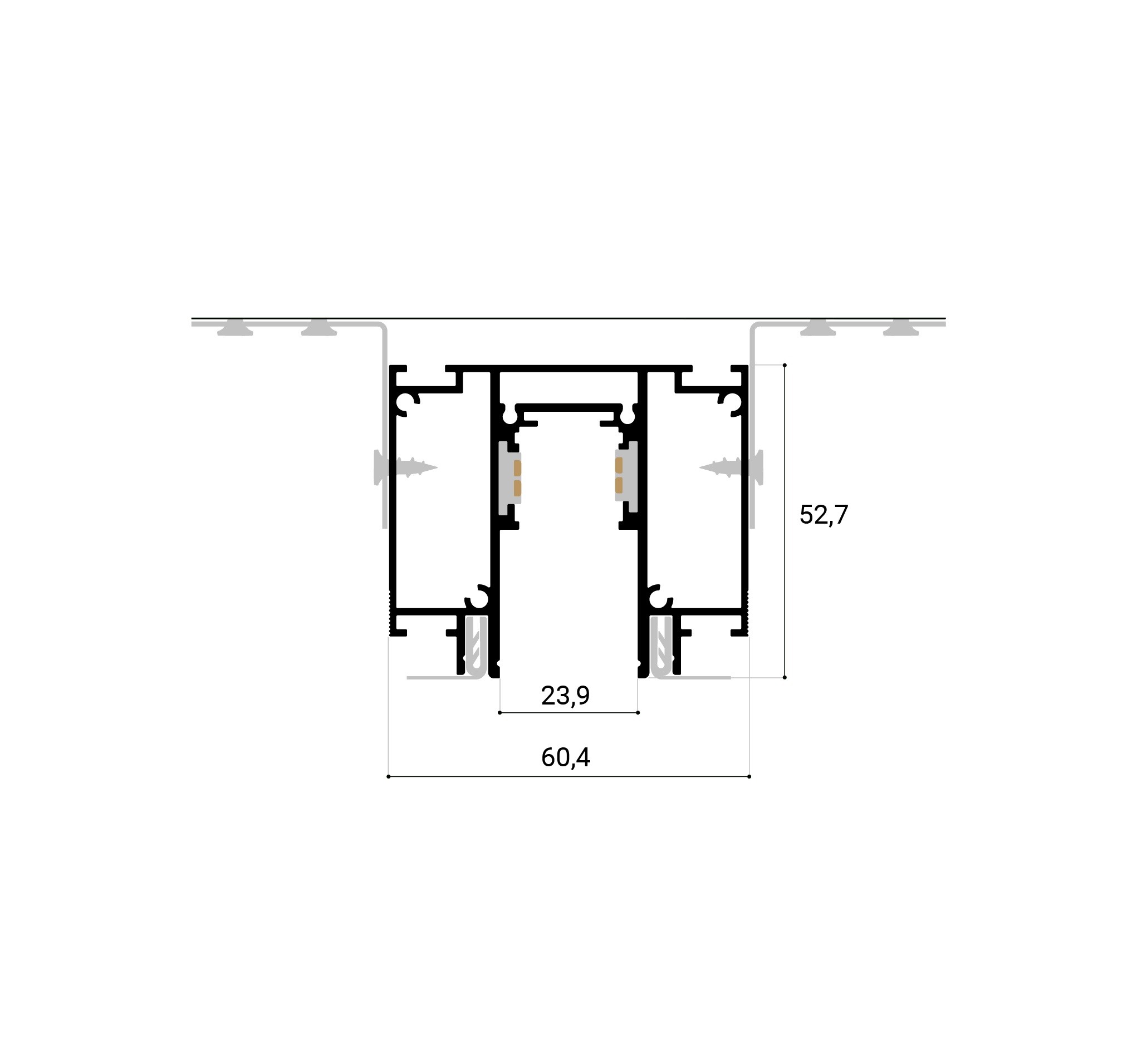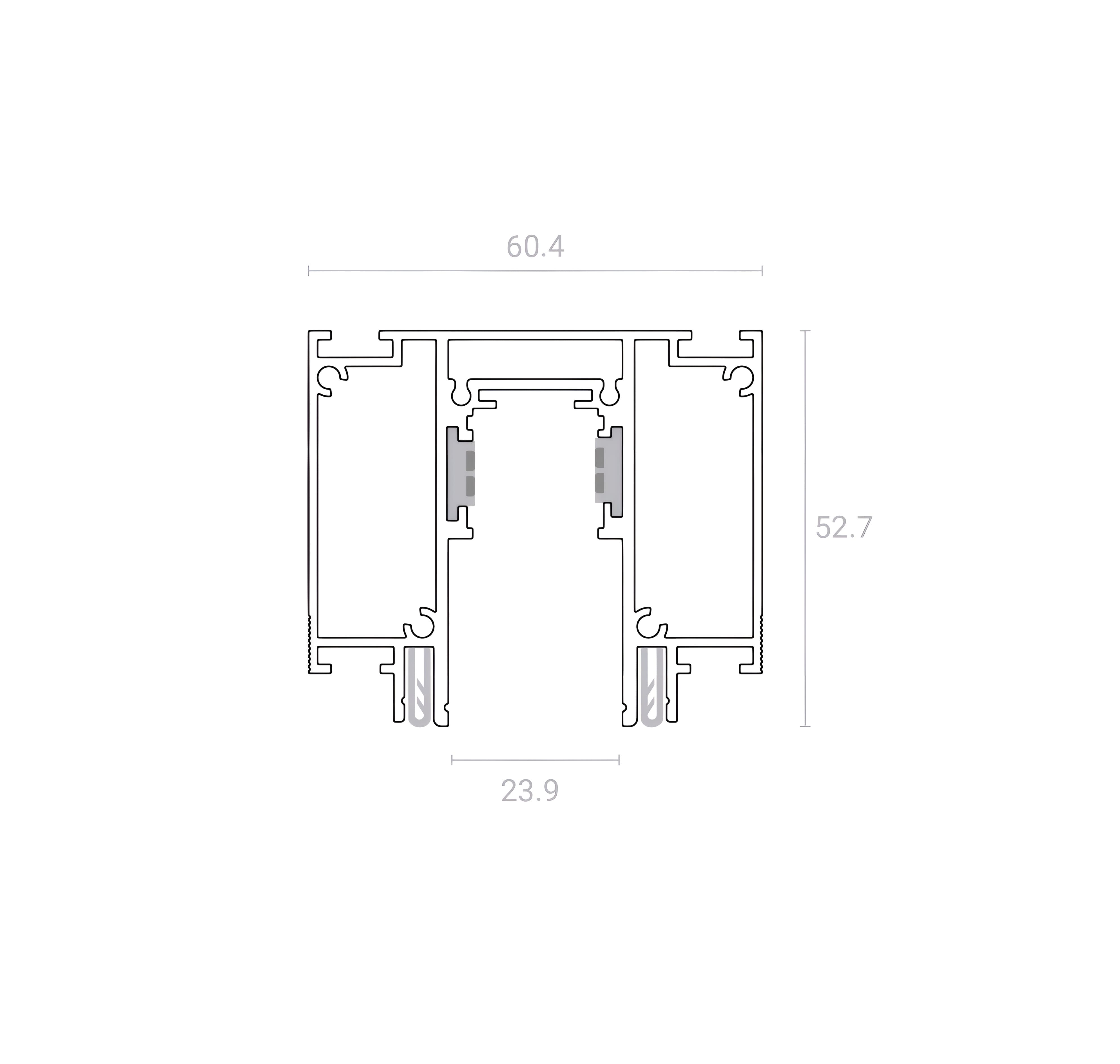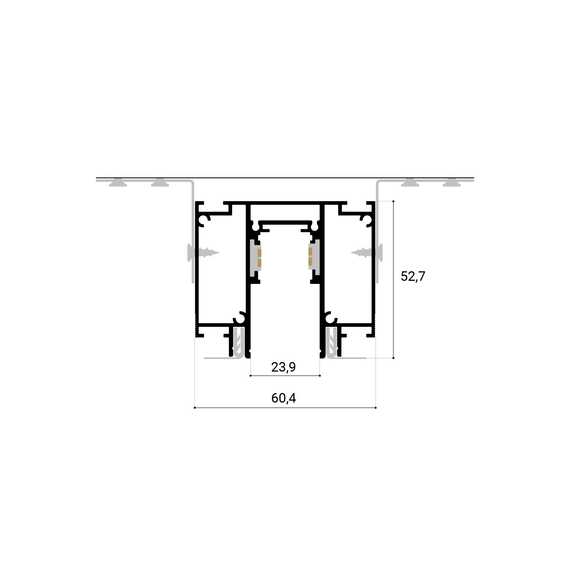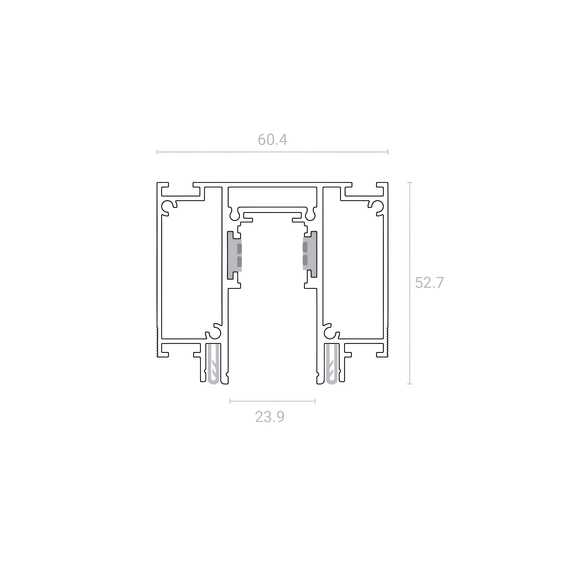 Токопроводящие шины располагаются на вертикальных стенках профиля. Такое положение делает их совершенно незаметными для глаза. Система обеспечена низковольтным питанием 48В.