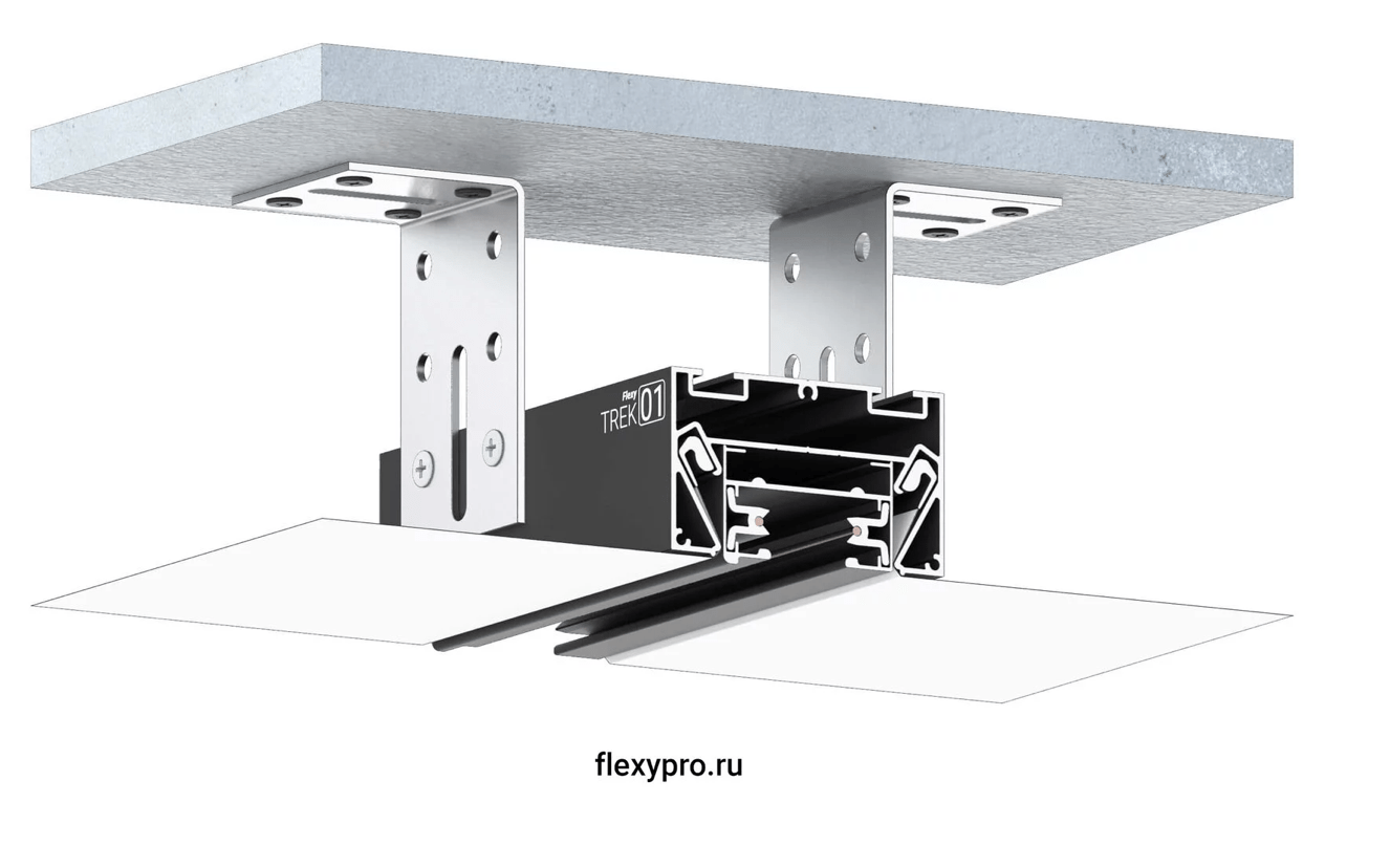 Разделительный профиль Flexy TREK 01 для натяжных потолков с гарпунной системой крепления полотна. Для установки однофазной трековой шины. Для изготовления встраиваемых и накладных световых линий, подвесных и накладных светильников, щелевых вытяжек.