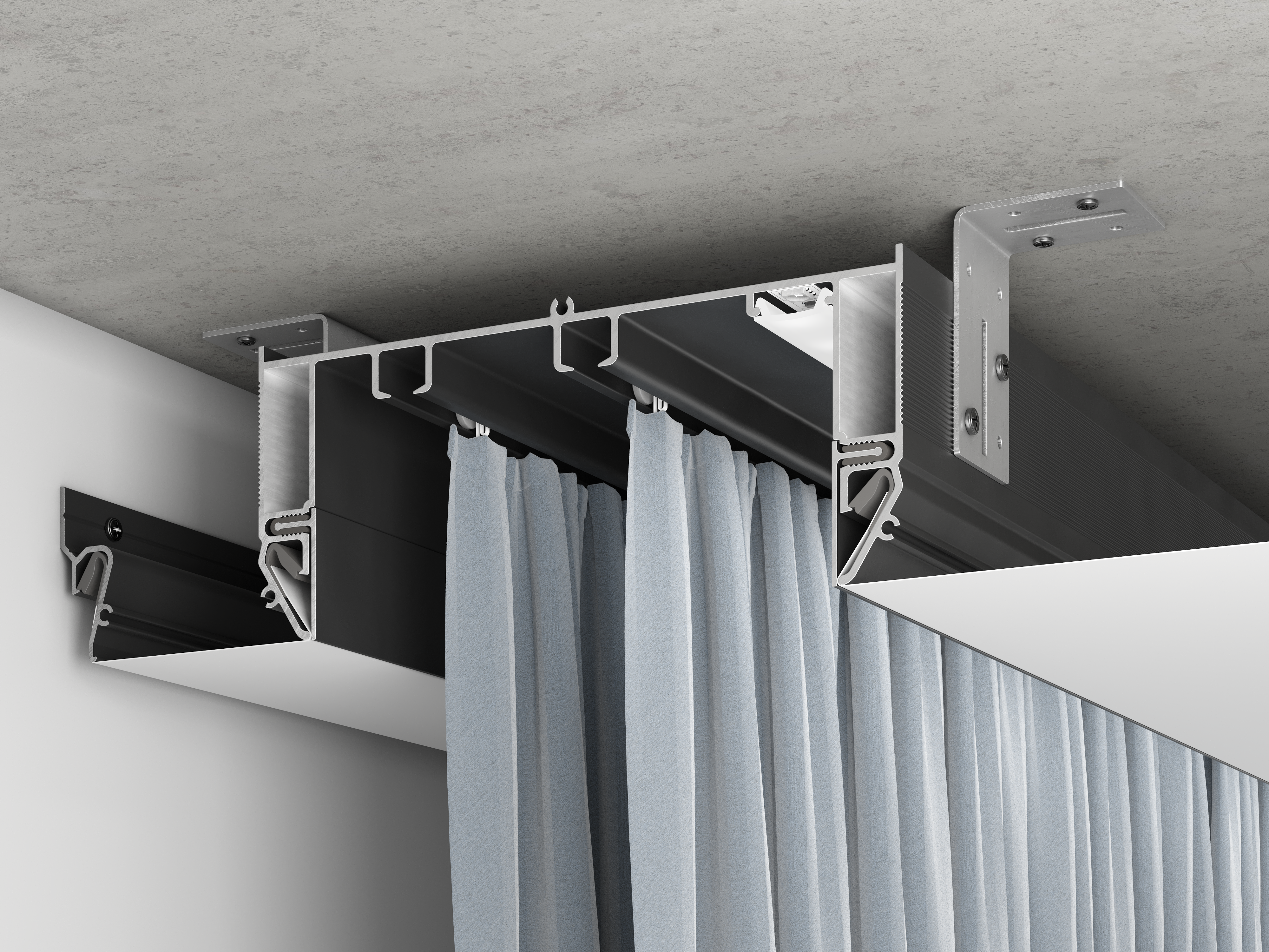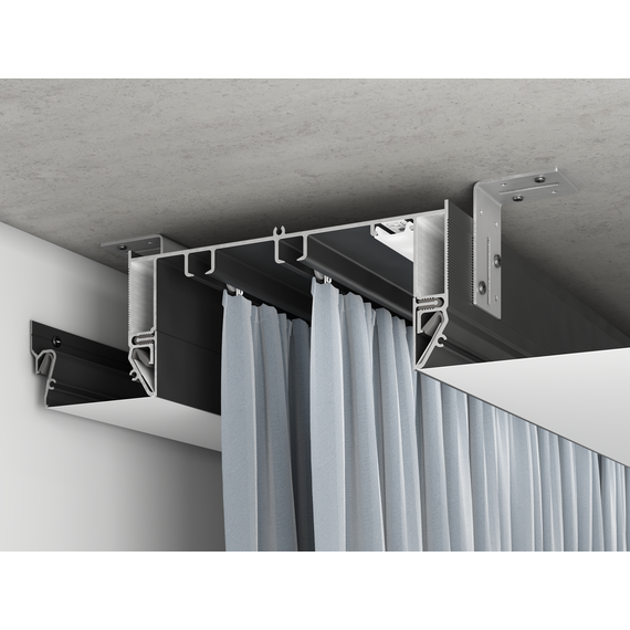 Глубина карниза 54 мм создает эффект парящих штор и скрывает крючки.