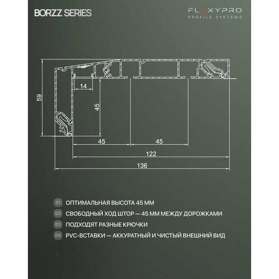 Профиль для изготовления скрытых карнизных ниш с двумя пазами под установку штор и тюля. Увеличенная глубина и расстояние между камерами 45 мм обеспечивают плавный и бесшумный ход бегунков. Пазы под гарпун закрываются PVC-вставкой.