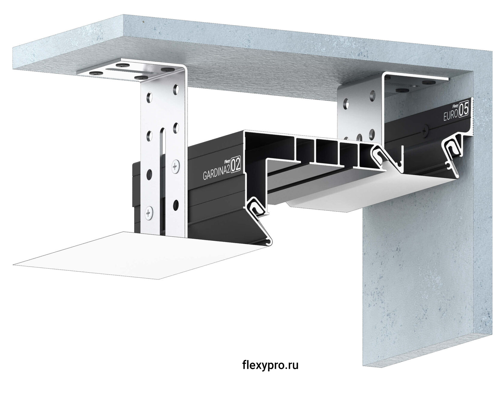 Профиль Flexy GARDINA2 02 для изготовления скрытых карнизных ниш с двумя пазами для установки штор и гардин. Для гарпунной системы крепления полотна с боковой заправкой.