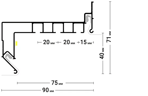 Профиль монтируется на стену, образуя скрытую нишу для установки карниза, что позволяет создать эффект невидимой крепежной системы , а также имеет различные размеры, что позволяет создавать карнизные ниши для штор и гардин разных длин и типов.