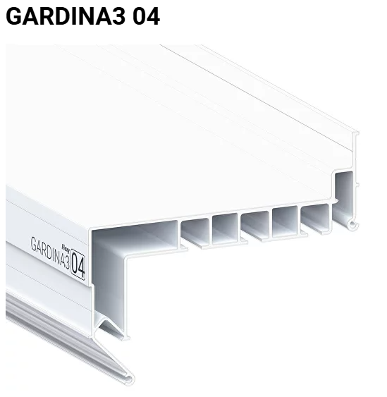 Профиль Flexy GARDINA3 04 для изготовления скрытых карнизных ниш с тремя пазами для установки штор и гардин. Для гарпунной системы крепления полотна с нижней заправкой.