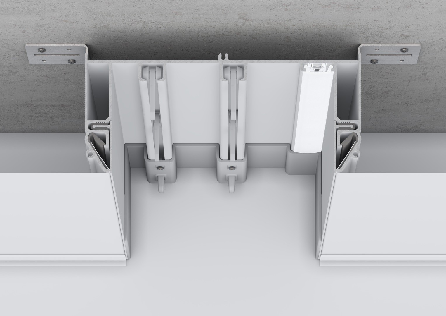 Скрытый «П-образный» карниз с алюминиевым бампером, подсветкой и креплением натяжного потолка в одной плоскости.