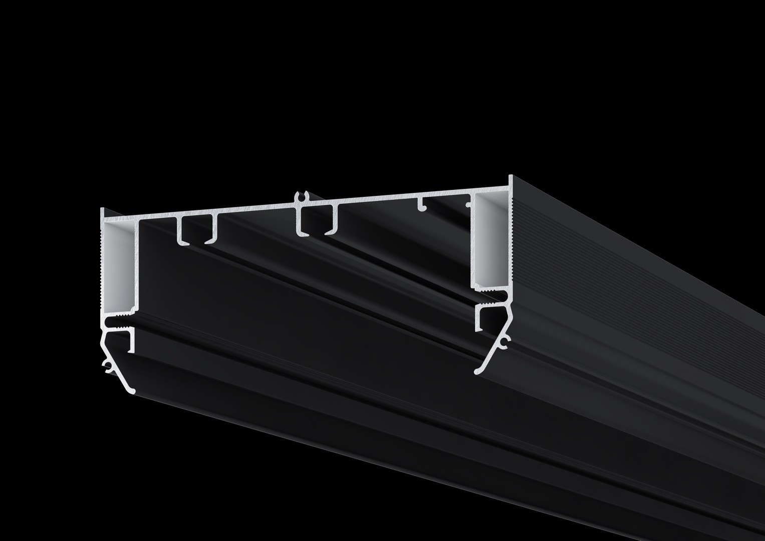 Скрытый «П-образный» карниз с алюминиевым бампером, подсветкой и креплением натяжного потолка в одной плоскости.