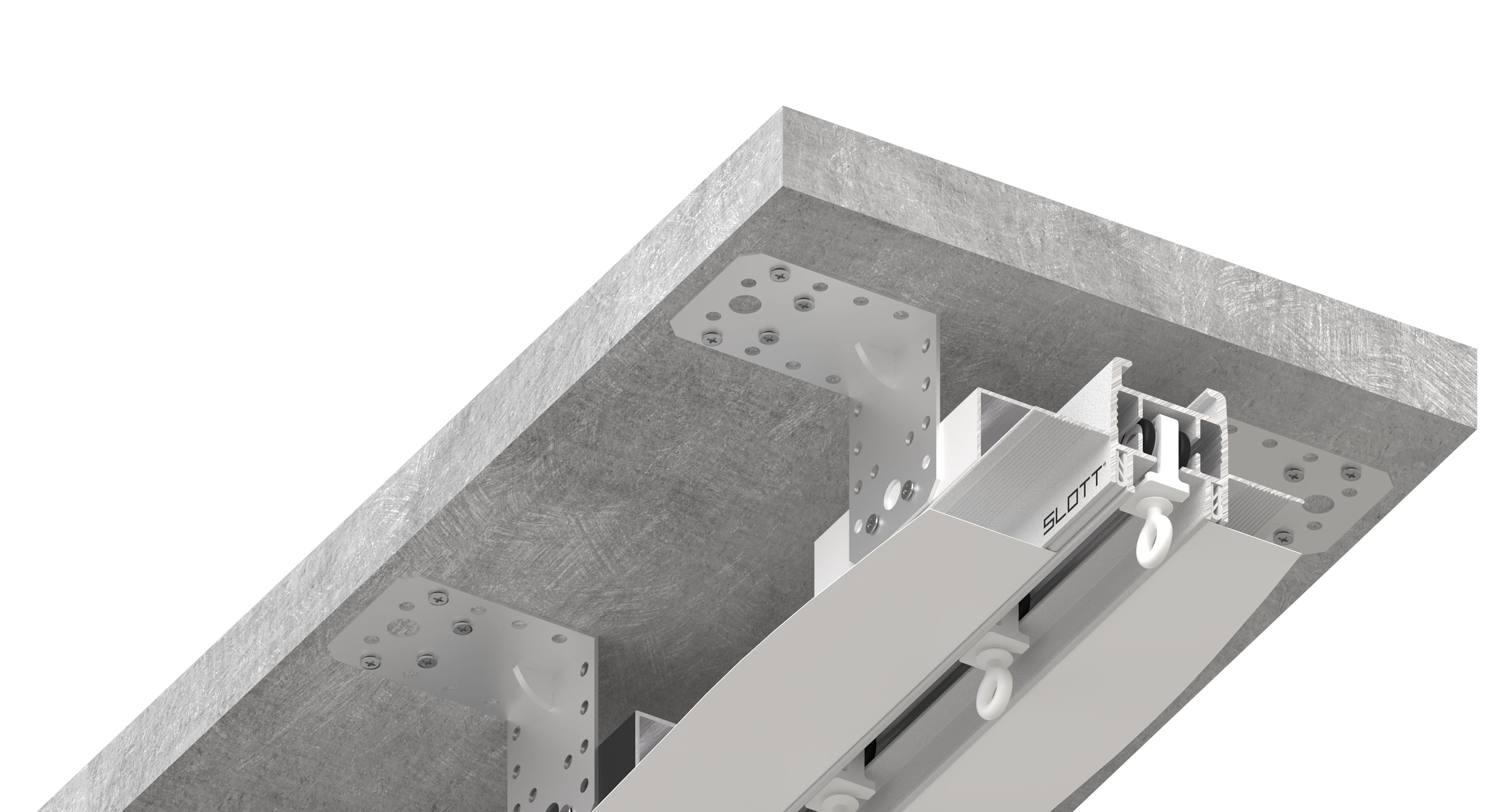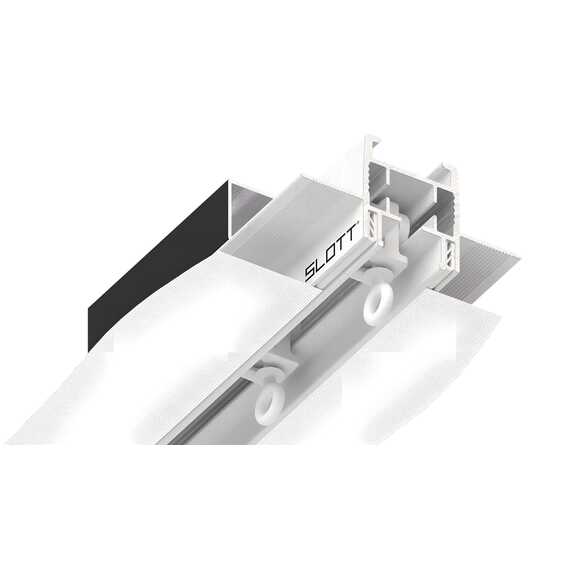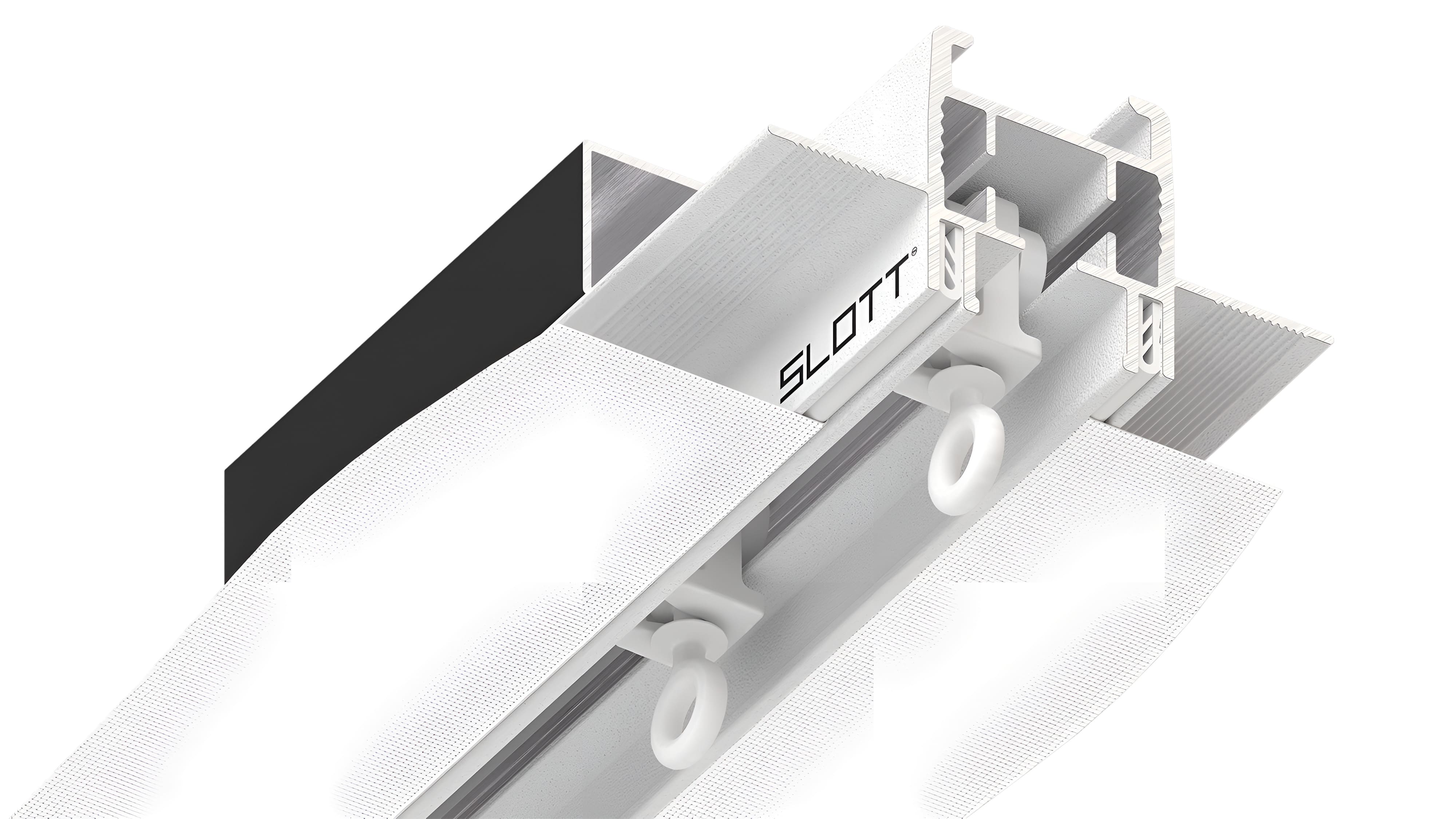 SLOTT Motion — первая карнизная система, встраиваемая в потолок без дополнительных профилей и ниш благодаря демпферной системе SLOTT. Она подходит для тканевых и ПВХ потолков. В комплекте поставляется профиль с демпфером.