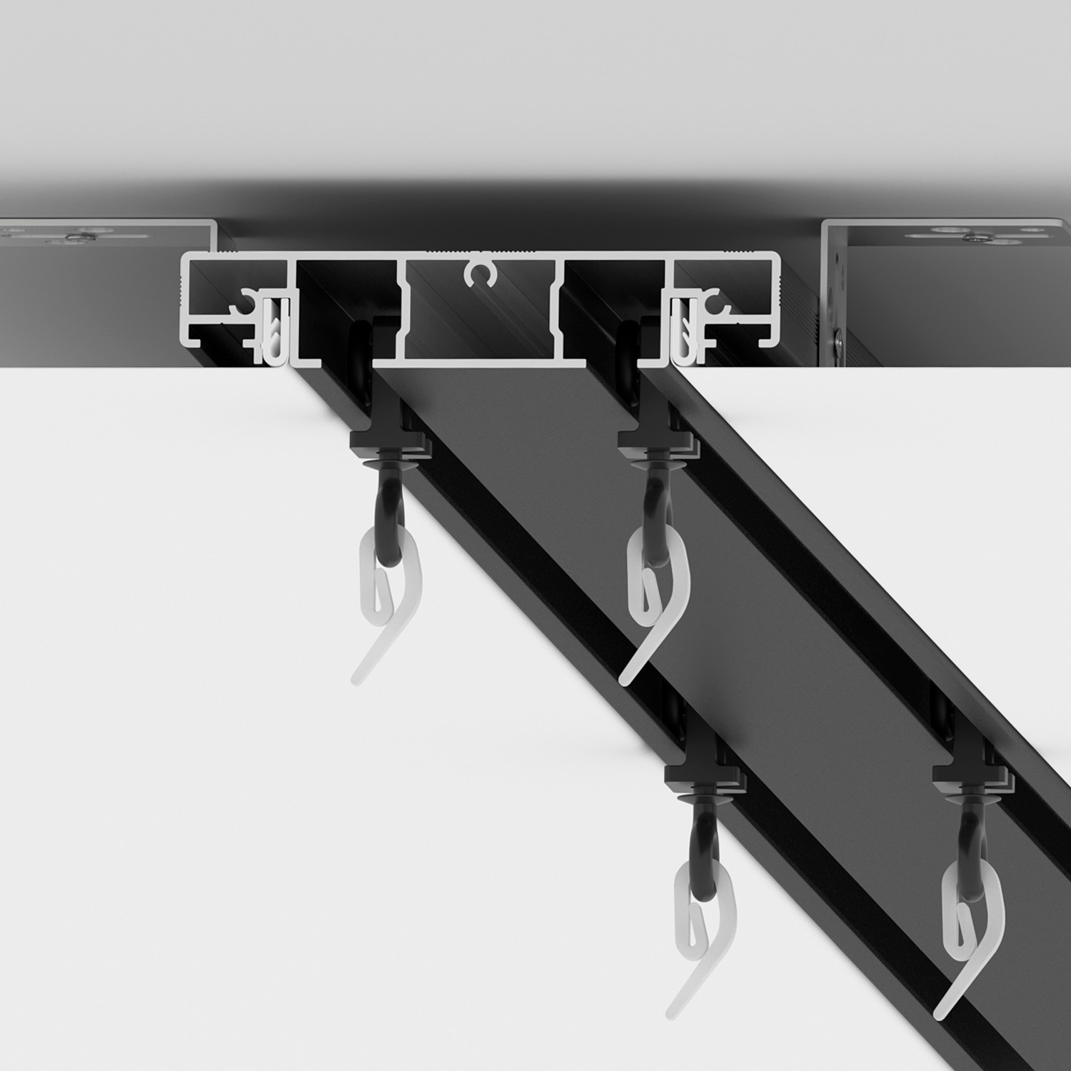 Важная особенность решения – наличие бесшумных прорезиненных бегунков белого или черного цвета. Система комплектуется демпфером для монтажа ПВХ и тканевых полотен.